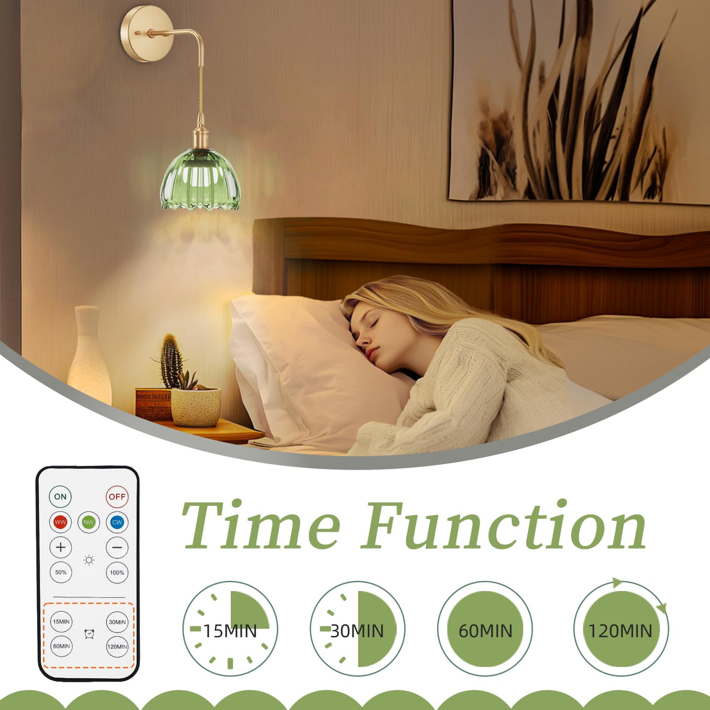 Kavedod Battery Operated Wall Sconces Cct Dimmable Wireless Sconces Set Of 2, Vintage Light Fixture With Green Tulip Glass Lamps