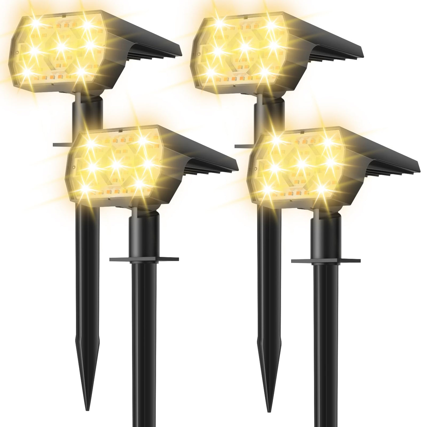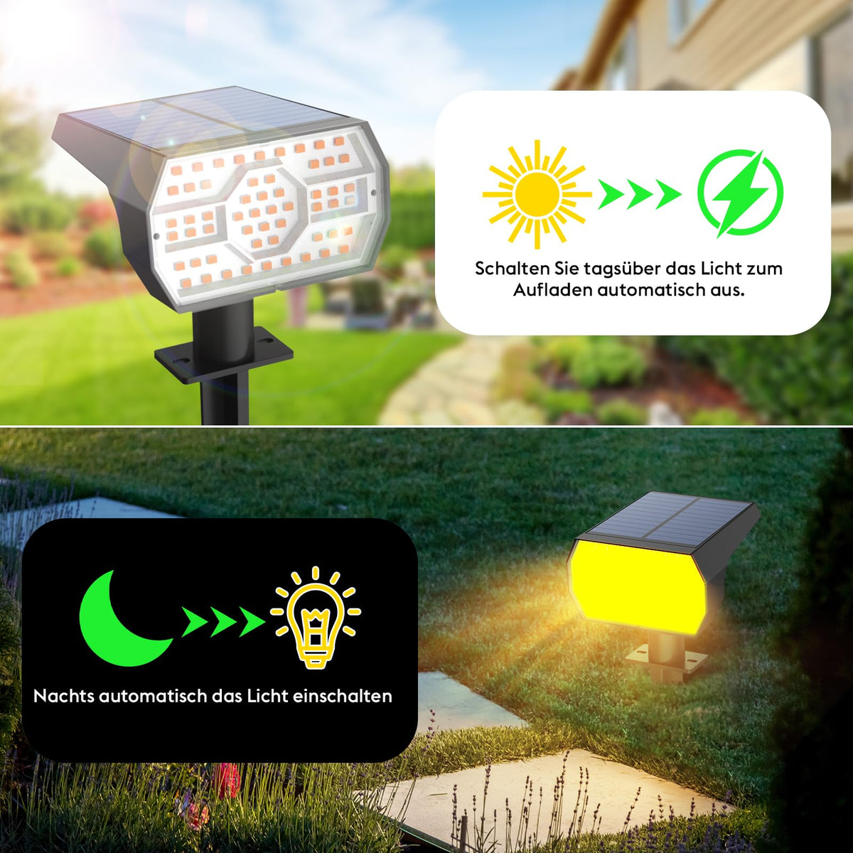 [Super bright & long time] Each solar powered outdoor light has 56 LED solar light bulbs, providing super bright lighting for your garden, patio, swimming pool and more. 1200mAh large battery powered outdoor led light can keep lighting for a long time | [IP67 waterproof] This solar lights outdoor waterproof shell is made of high-quality ABS material, the interface is well sealed, suitable for all kinds of weather, you don't have to worry that it will stop working after heavy rain, it can be used as an outdoor landscape decorative light | [Three brightness modes] This solar dusk to dawn lights outdoor has dim mode, bright mode and highlight mode to choose from, you can change the brightness of the lighting with a button to meet your different needs. After being fully charged, it can work continuously for 10 hours, 8 hours and 6 hours | [Energy saving solar panel] The solar outdoor lights is equipped with a 90°adjustable solar panel and built-in light sensor, which can store enough solar energy into the battery to ensure that the solar garden light outdoor waterproof can work overnight | [Easy to install] This yard lights outdoor solar powered does not require wires, it can be fixed on the ground with its own ground stakes as a street light to illuminate the path, or it can be screwed to the wall as a wall light to illuminate the porch, and it can also be used as a landscape light to illuminate statues , trees, swimming pool, garden, etc