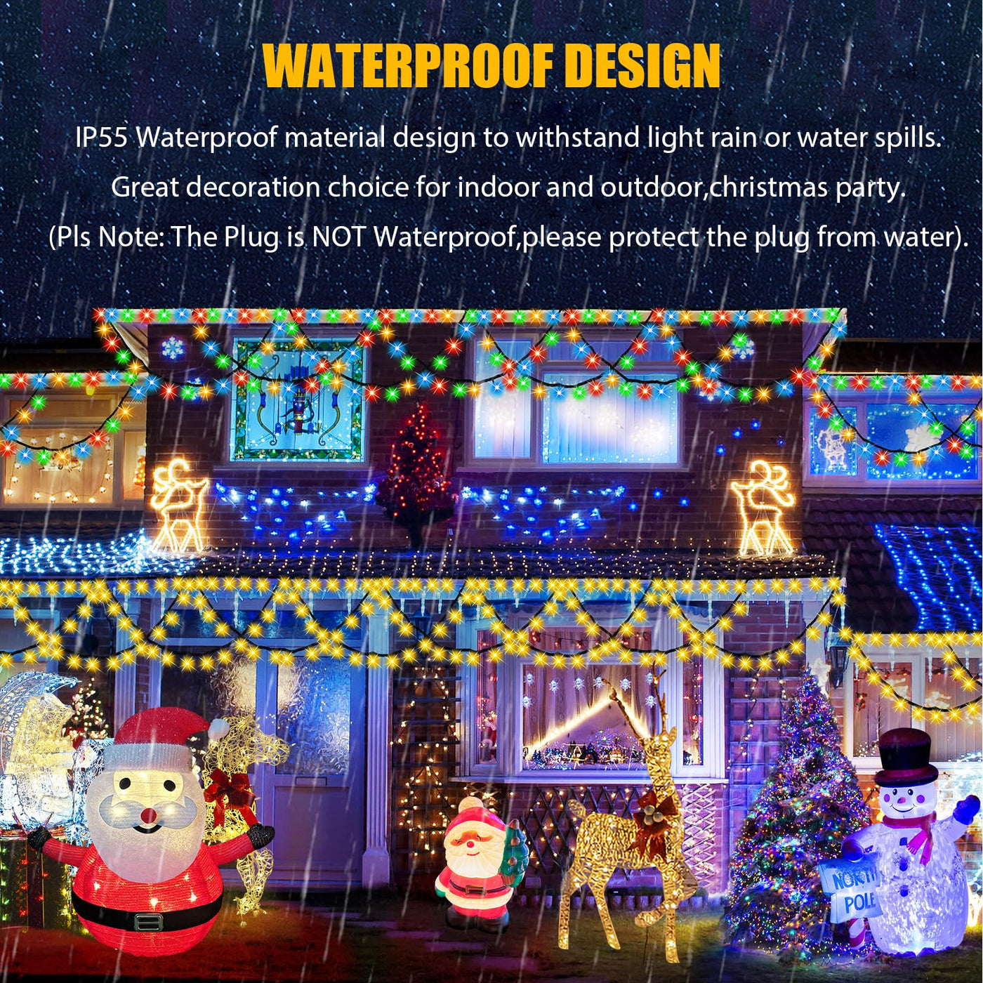 Q: Are these fairy string lights suitable for outdoor use?A: Yes, the KAZOKU Christmas lights are designed with an IP55 waterproof rating, making them suitable for outdoor use in light rain or snow. However, please ensure that the plug is protected from water as it is not waterproof.