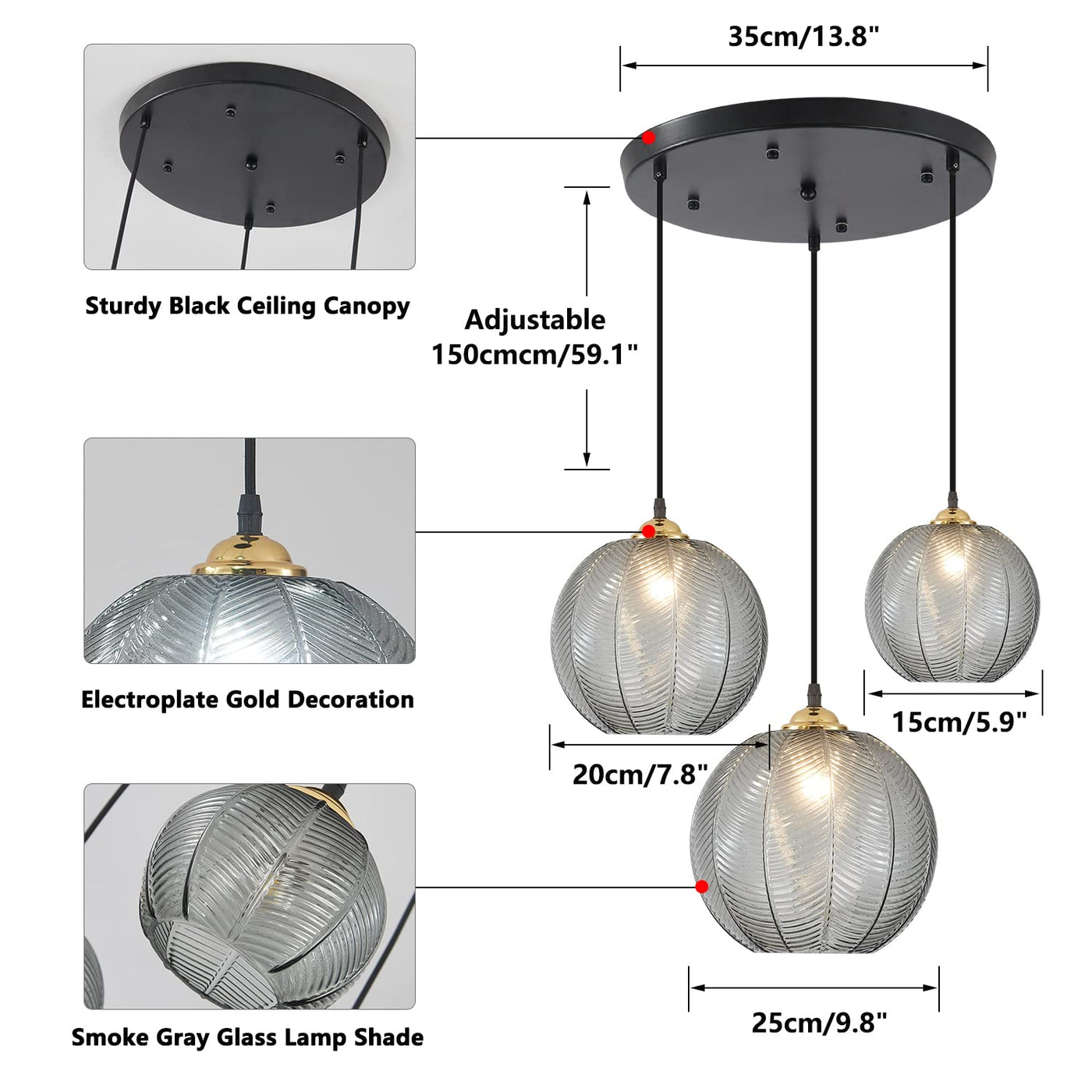 - **Versatile 3-Lights Configuration**: With glass globe lampshade diameters of 5.9” (15cm), 7.9” (20cm), and 9.8” (25cm), this lighting fixture is perfect for creating a warm, inviting atmosphere in dining rooms, kitchens, living rooms, and more.