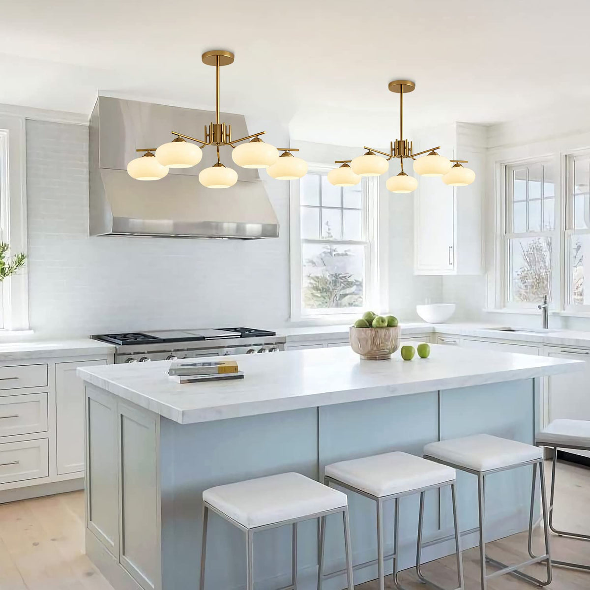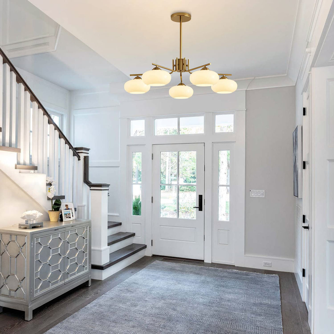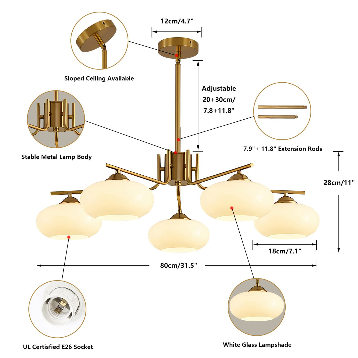 - **Modern Globe Chandelier Design**: Features five milk white glass shades evenly distributed on gold-finished arms, providing a classic yet stylish aesthetic that enhances any interior space.