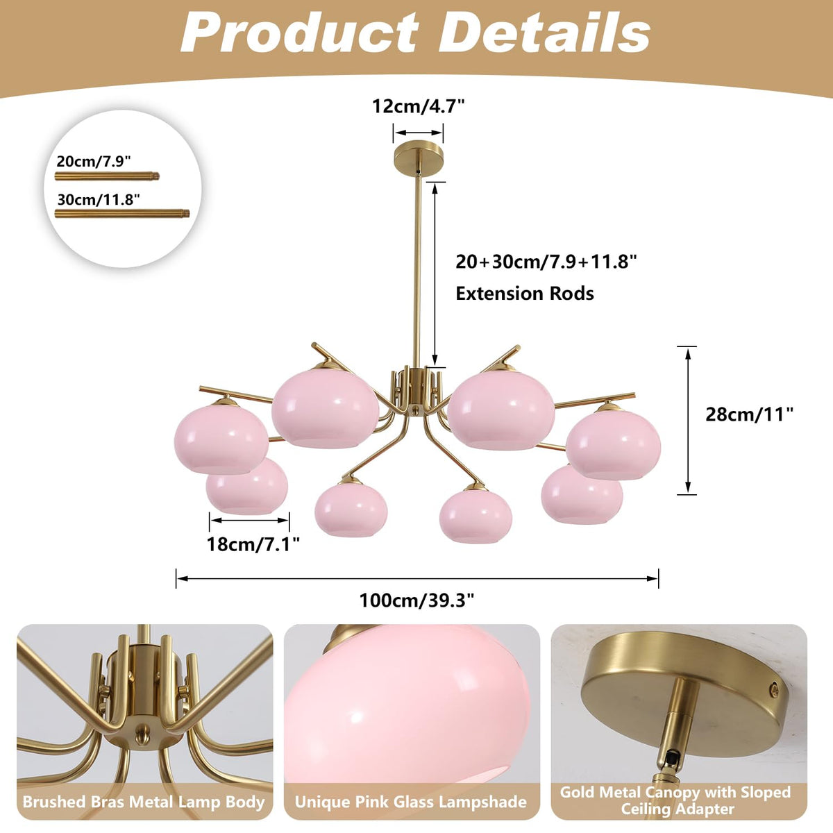 - **Unique Pink Glass Globes**: Adorned with eight beautiful pink glass lampshades, this chandelier adds a touch of sophistication and style to any room, making it a striking centerpiece for your decor.