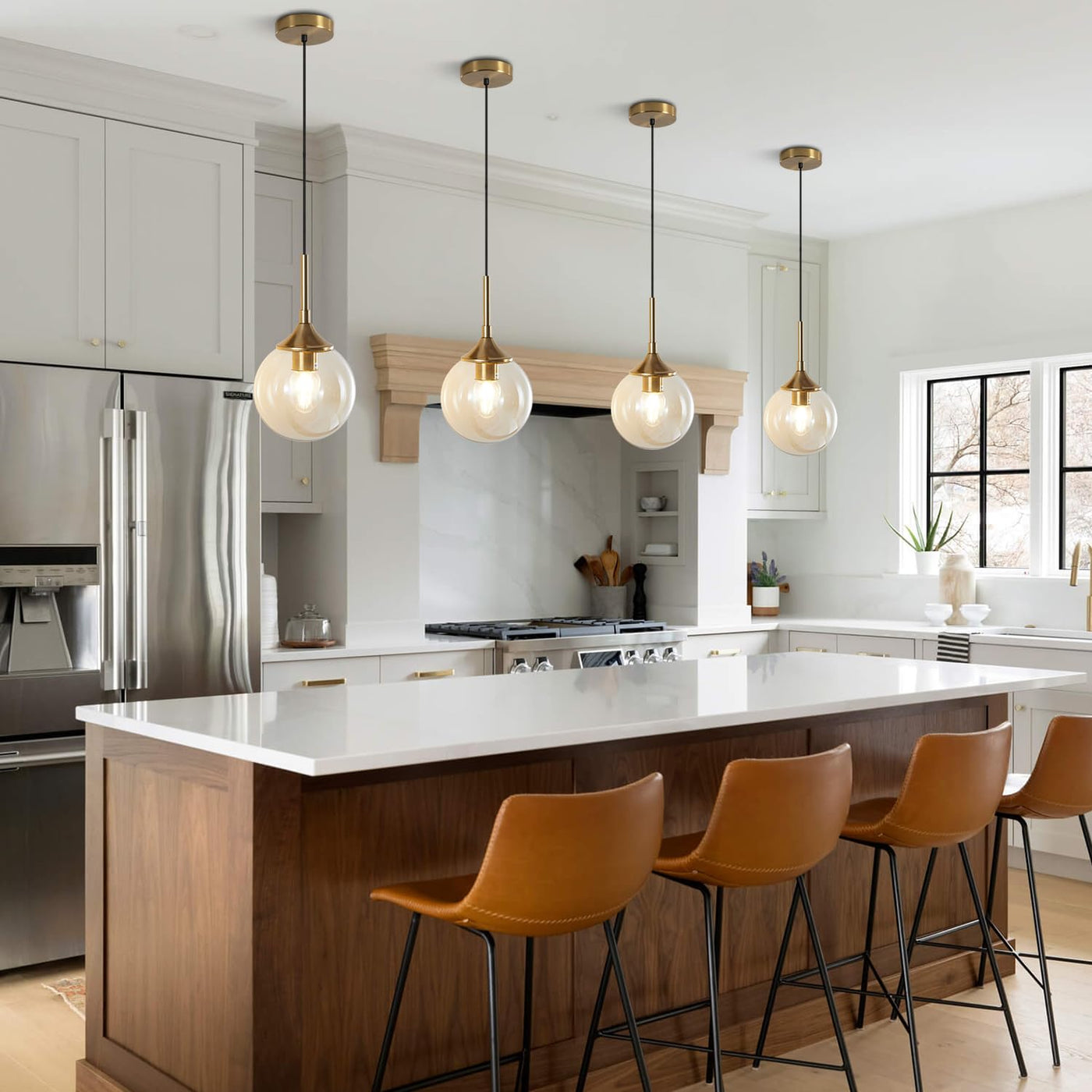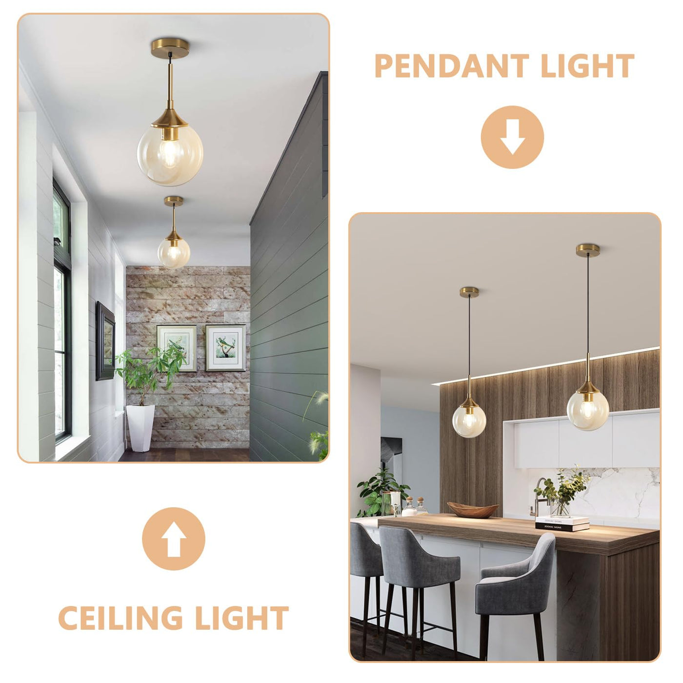 Kco Gold Amber Glass Globe Pendant Light, Mid Century Modern 1-Light Fixture (2-Pack)