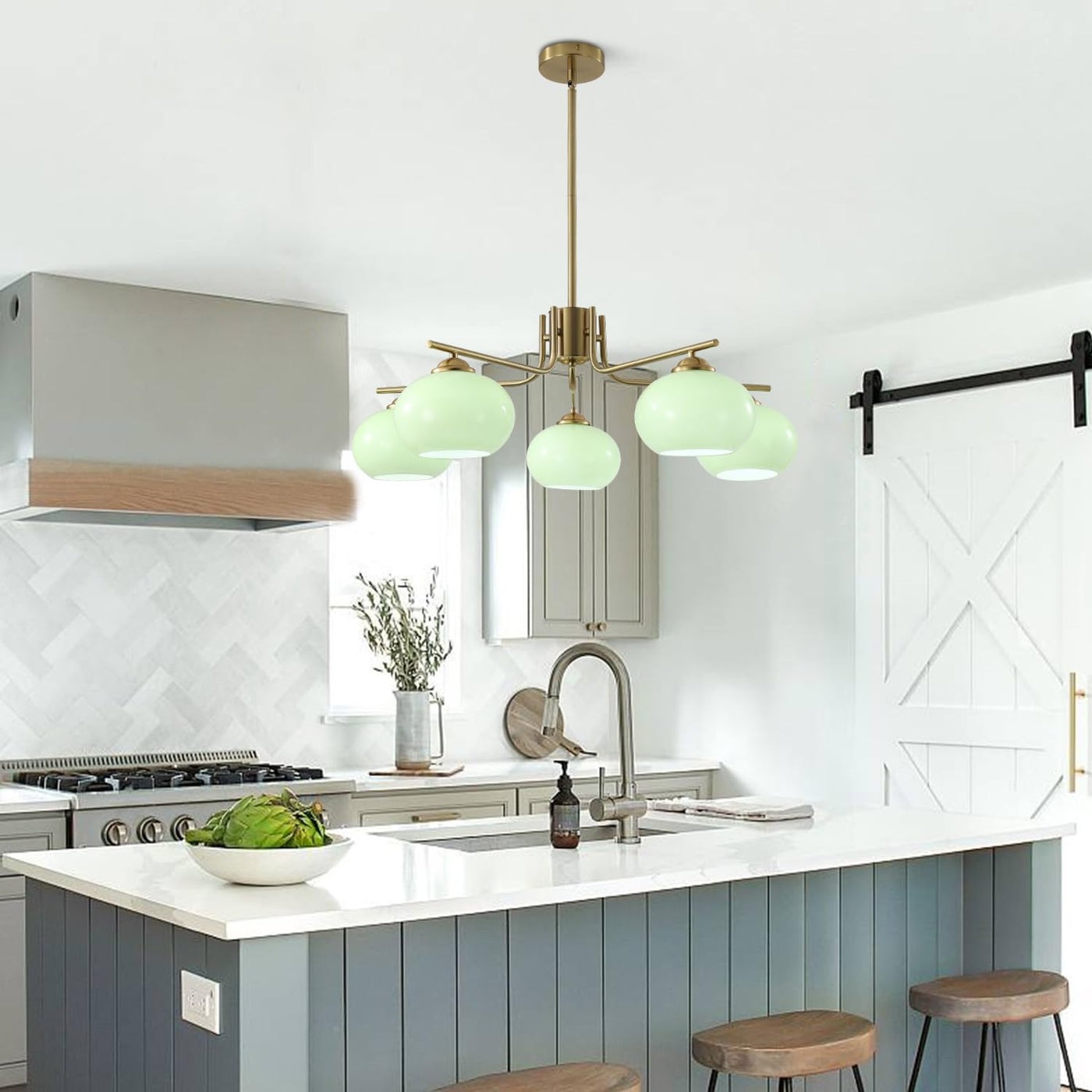 Kco Green Glass Pendant Light 5-Light Brushed Brass Sputnik Chandelier, Mid Century Modern