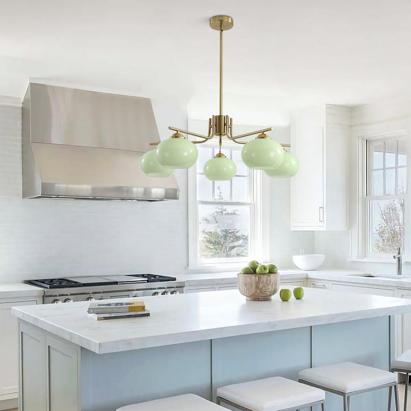 - **Elegant Design**: This 5-Light Pink Pendant Light features a stunning combination of brass metal and green glass, creating a modern texture that enhances the aesthetic of any room. The Nordic green glass lampshade adds a touch of sophistication and timeless elegance.