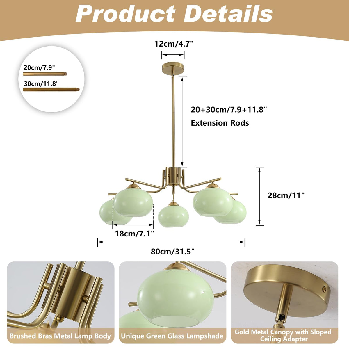 - **Versatile Height Adjustment**: Equipped with two extension rods, this chandelier allows for adjustable heights, ranging from a minimum of 7.9" to a maximum of 19.7". Ideal for both low and high ceilings, it seamlessly fits various spaces.