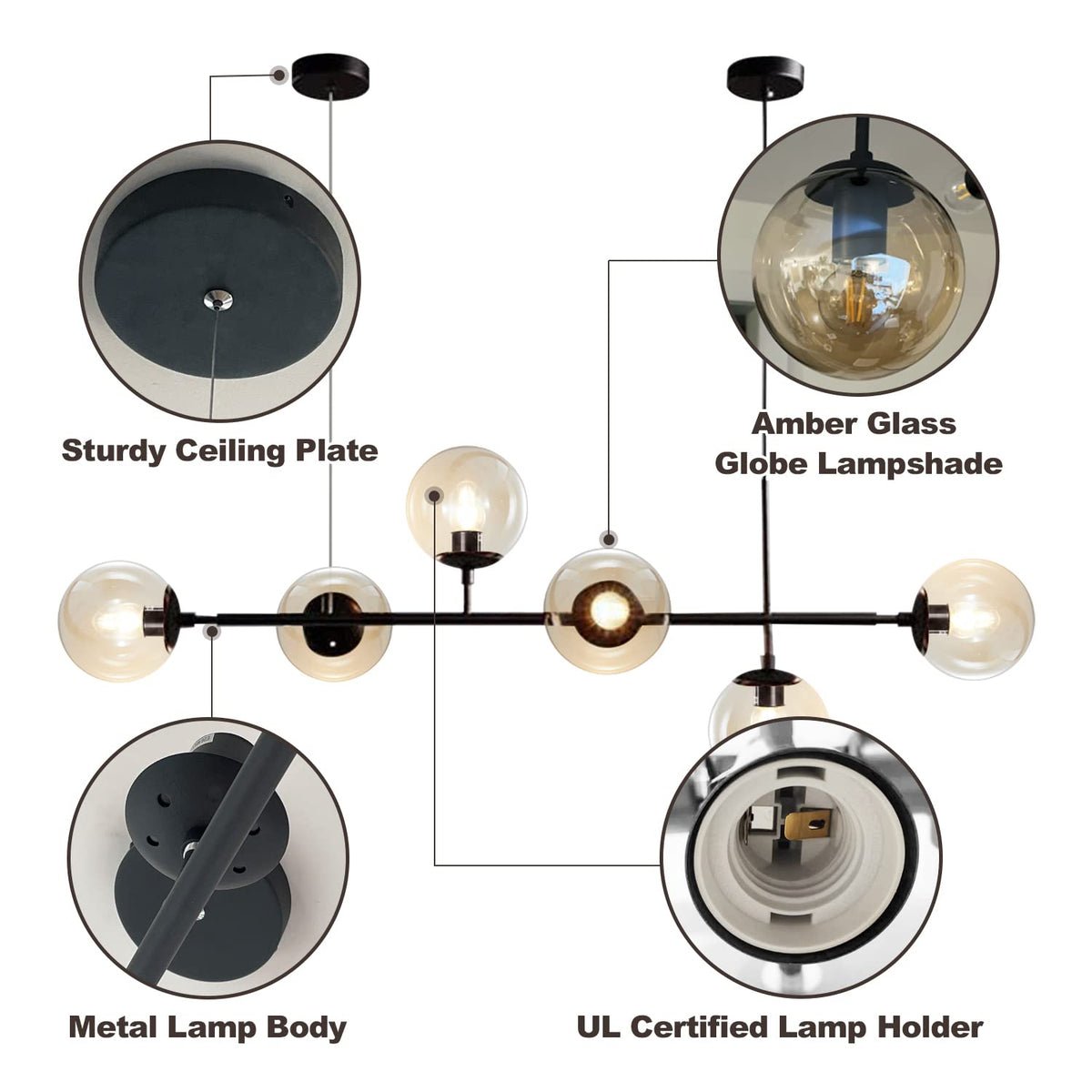 Kco Lighting 6-Light Modern Globe Sputnik Chandelier Mid Century Black Pendant Light Chandelier Dining Room Linear Pendant Light