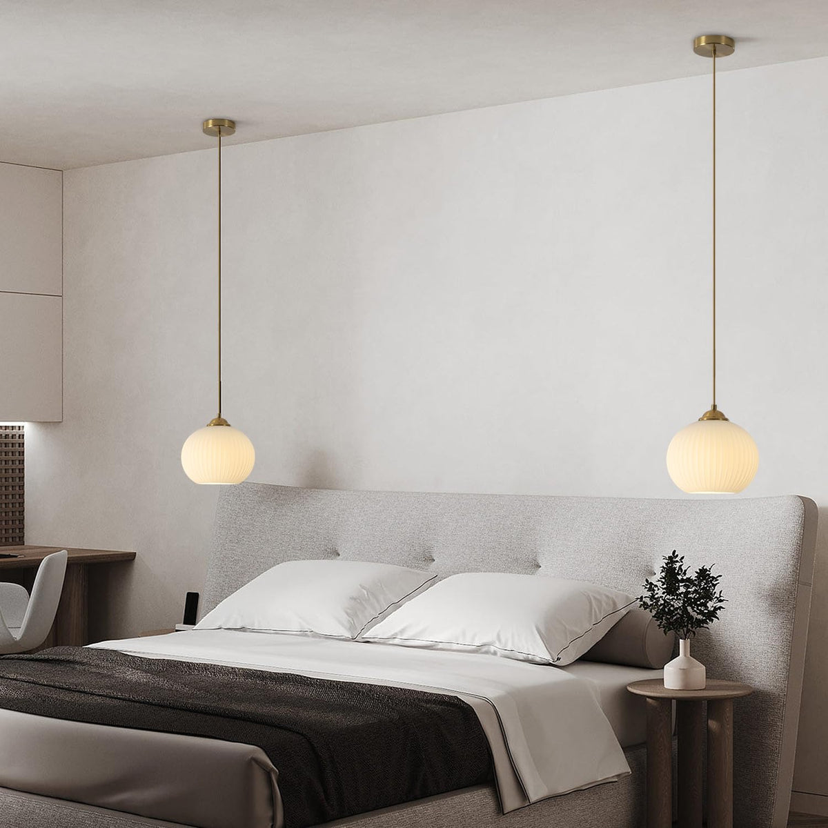 Description: Name: Modern Globe Pendant Light Style: Modern/ Nordic/ Contemporary Material: Metal & Glass Color: Gold & White Hanging Cord: 59 (150Cm) Canopy Size: 4.7 (12Cm) Light Source: E26 Base Bulb Size: G45/A15/A19 Type Of Bulb: Incandescent, Led, Cfl And Halogen Bulbs Special Feature: Adjustable Height Specific Uses: Indoor Voltage: 110-250V For Worldwide Wattage: Max 60 Watts Recommended Area: 5-8M Package Listed: 1*Modern Globe Pendant Light 1* Accessories Kit 1* Customer Manual Warm Tips: 1. For A Longer Service Life, Please Install And Use It In A Dry Environment. 2. Do Not Touch The Light Bulb When It Is Working Well. 3. Keep Flammable Materials Away From The Lamp. 4. Before Replacing The Light Bulb, Cut Off The Electricity Supply And Allow The Bulb To Cool.