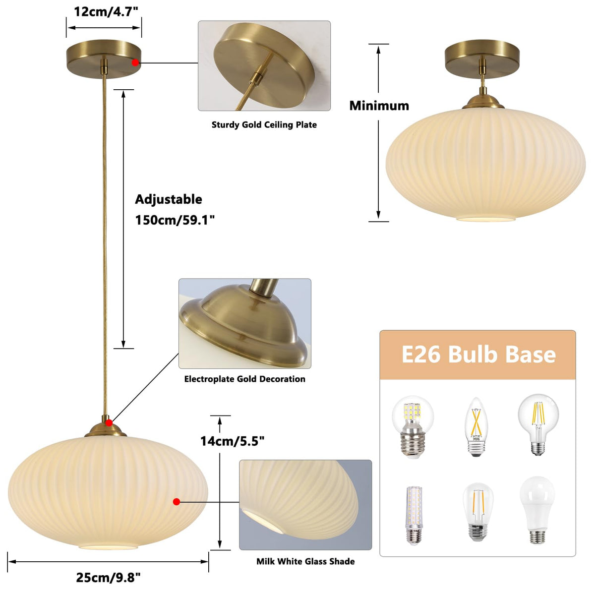 Description: Name: Modern Globe Pendant Light Style: Modern/ Nordic/ Contemporary Material: Metal & Glass Color: Gold & White Hanging Cord: 59 (150Cm) Canopy Size: 4.7 (12Cm) Light Source: E26 Base Bulb Size: G45/A15/A19 Type Of Bulb: Incandescent, Led, Cfl And Halogen Bulbs Special Feature: Adjustable Height Specific Uses: Indoor Voltage: 110-250V For Worldwide Wattage: Max 60 Watts Recommended Area: 5-8M Package Listed: 1*Modern Globe Pendant Light 1* Accessories Kit 1* Customer Manual Warm Tips: 1. For A Longer Service Life, Please Install And Use It In A Dry Environment. 2. Do Not Touch The Light Bulb When It Is Working Well. 3. Keep Flammable Materials Away From The Lamp. 4. Before Replacing The Light Bulb, Cut Off The Electricity Supply And Allow The Bulb To Cool.