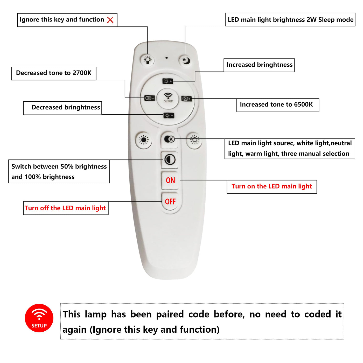 Q: How do I control the color temperature and brightness of the ceiling light?A: To control the ceiling light's color temperature and brightness, use the included remote control. Point the remote at the ceiling light and press the 'SETUP' button for 3-5 seconds to establish a connection.