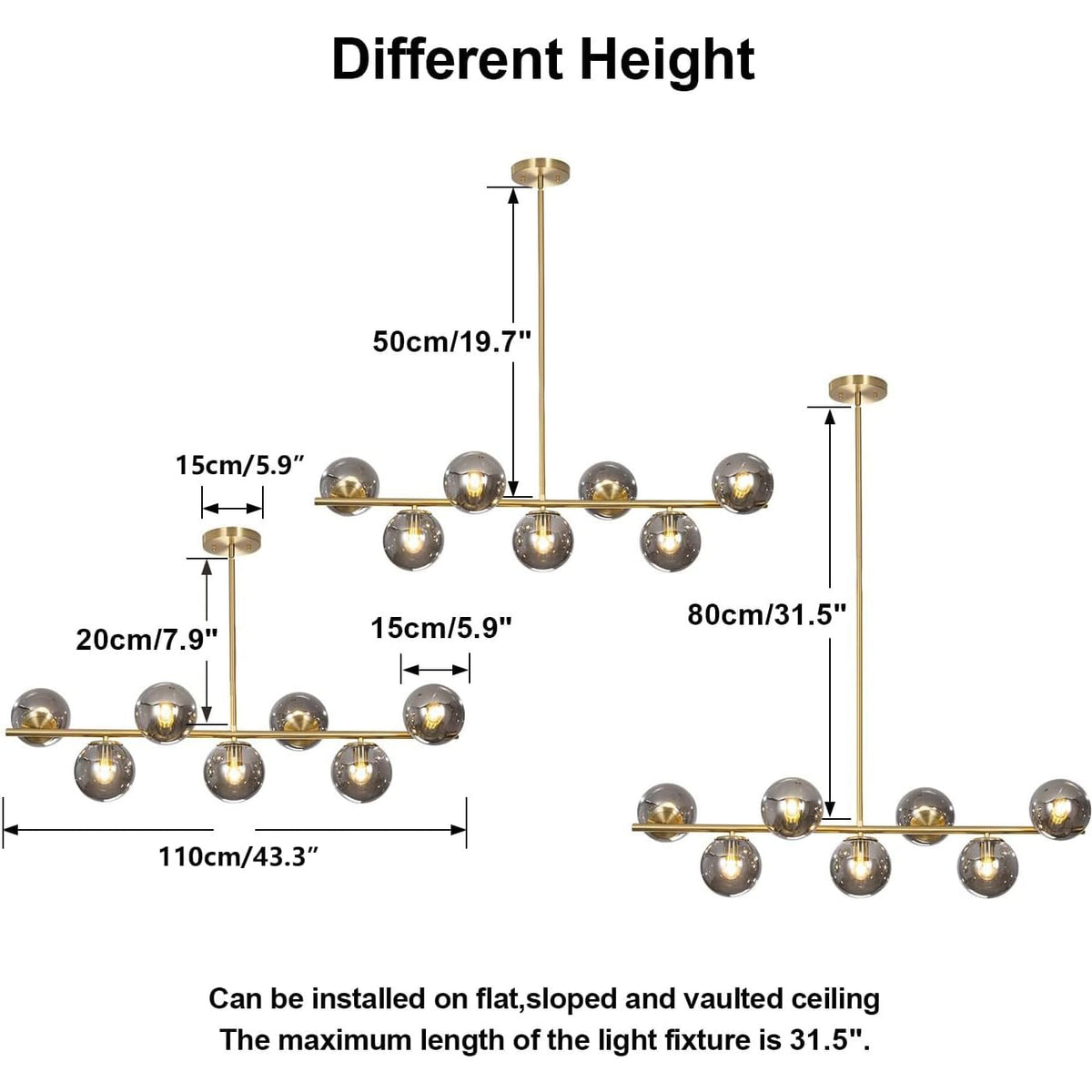 Q: What are the dimensions of the KCO Lighting Mid Century Chandelier?A: The chandelier measures 43.3 inches in length and 13.8 inches in height, with a canopy diameter of 4.7 inches. The globe diameter is 5.9 inches.