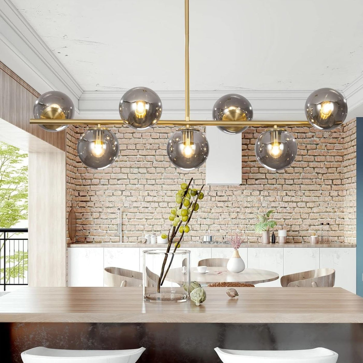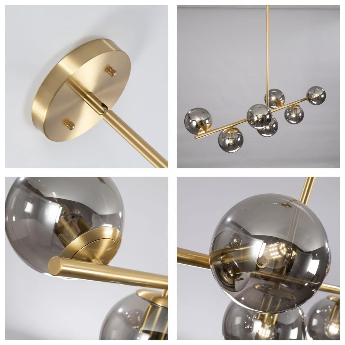 - ?Modern Globe Chandelier? Enhance your space with a stunning black globe linear chandelier featuring a sleek design and 7 smoke grey glass lampshades. Its unique sputnik shape offers a contemporary aesthetic that pairs well with modern decor.