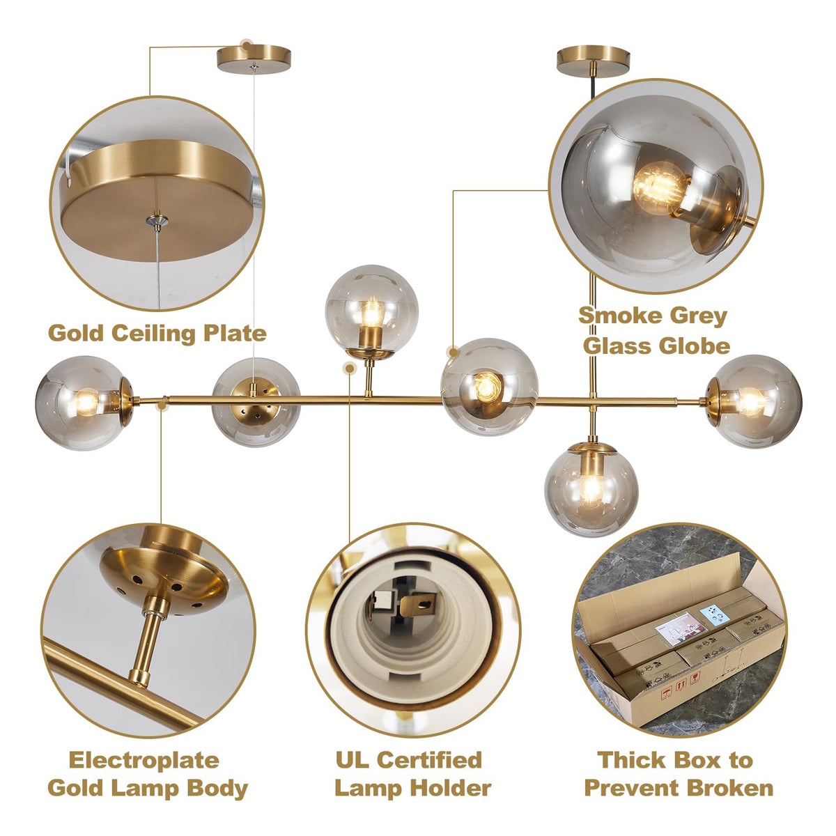 Modern Design: Features six smoke gray glass shades and a sleek metal frame, offering a contemporary yet timeless look that enhances your décor.