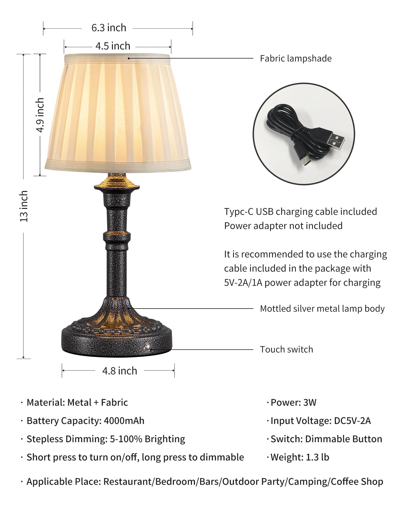Q: What are the dimensions and weight of the lamp?A: The lamp stands 13 inches high and has a width of 6.3 inches, making it compact and easy to fit into various spaces. It weighs approximately 1.3 pounds, allowing for convenient portability.