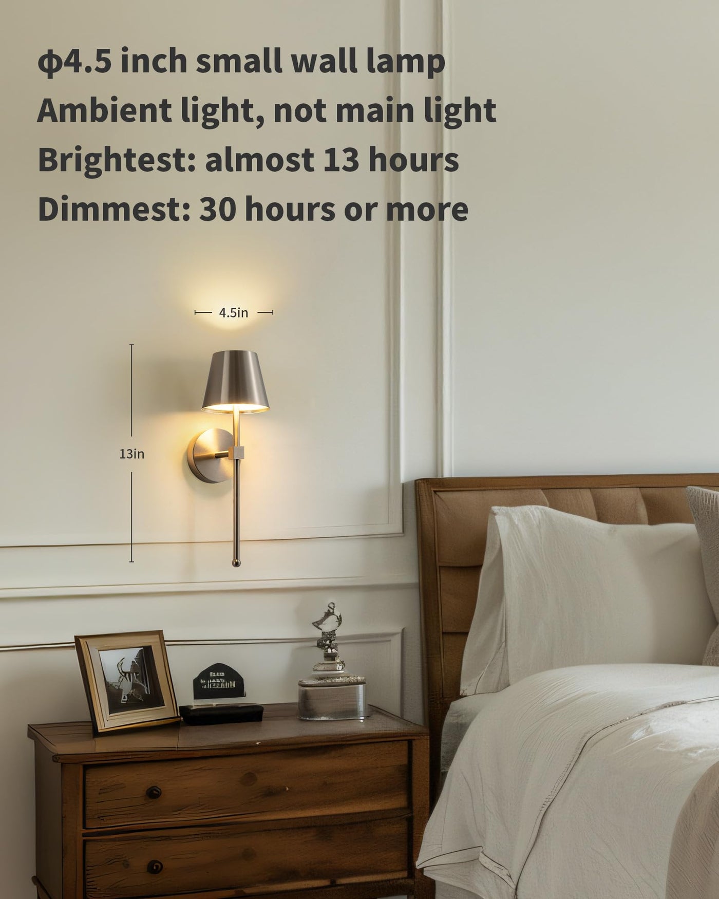 With a built-in 5200mAh Type-C rechargeable battery, this sconce provides a convenient lighting solution. It takes approximately 4-6 hours to fully charge, offering up to 13 hours of use at maximum brightness and over 30 hours at a minimal setting. The touch-sensitive controller allows for stepless dimming, enabling users to adjust brightness from 5% to 100% according to their needs. Additionally, three color temperature options (2700K, 3000K, and 4000K) cater to different atmospheres, whether you desire a warm ambiance or bright illumination.