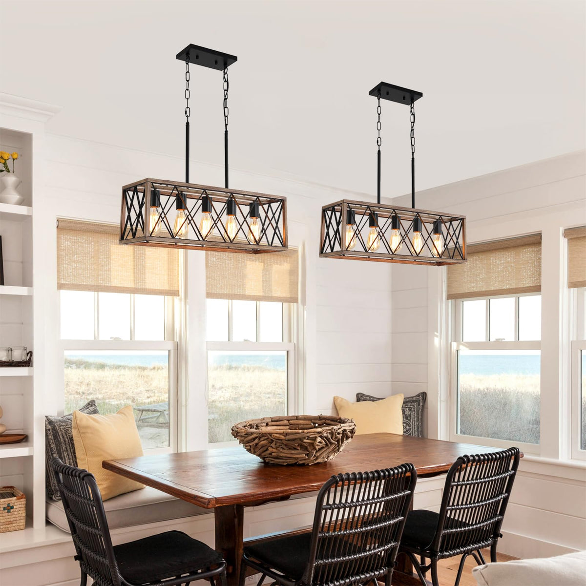 Q: What materials are used in the construction of this light fixture?A: The KEESFU 5-Light Dining Room Light Fixture is constructed from sturdy metal, featuring a classic geometric frame shape with faux painted wood grain accents, ensuring both durability and style.