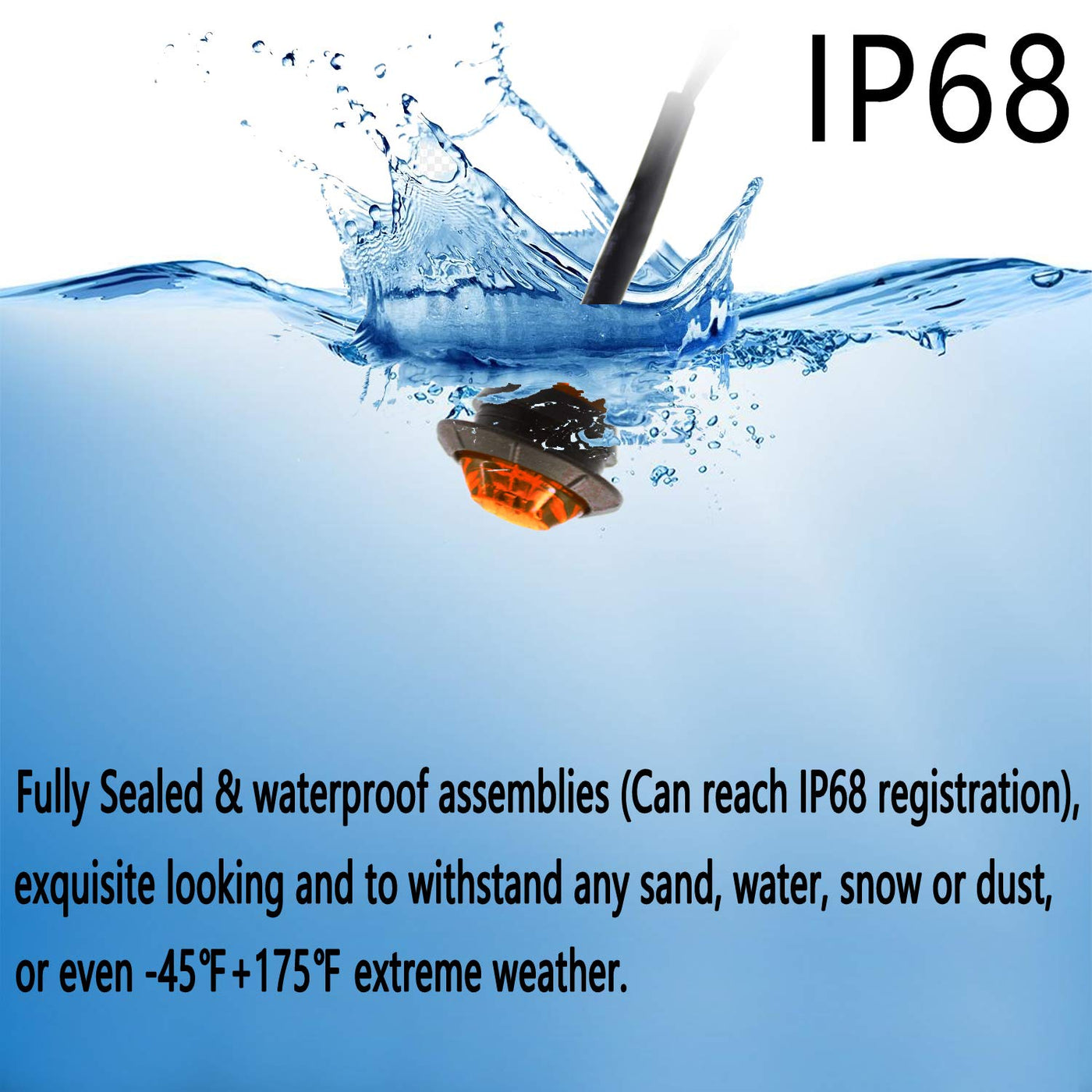 Q: Are the KEING Amber LED lights waterproof?A: Yes, the KEING Amber LED lights are rated IP68 for waterproofing, meaning they are designed to withstand exposure to water and can be used in marine environments.
