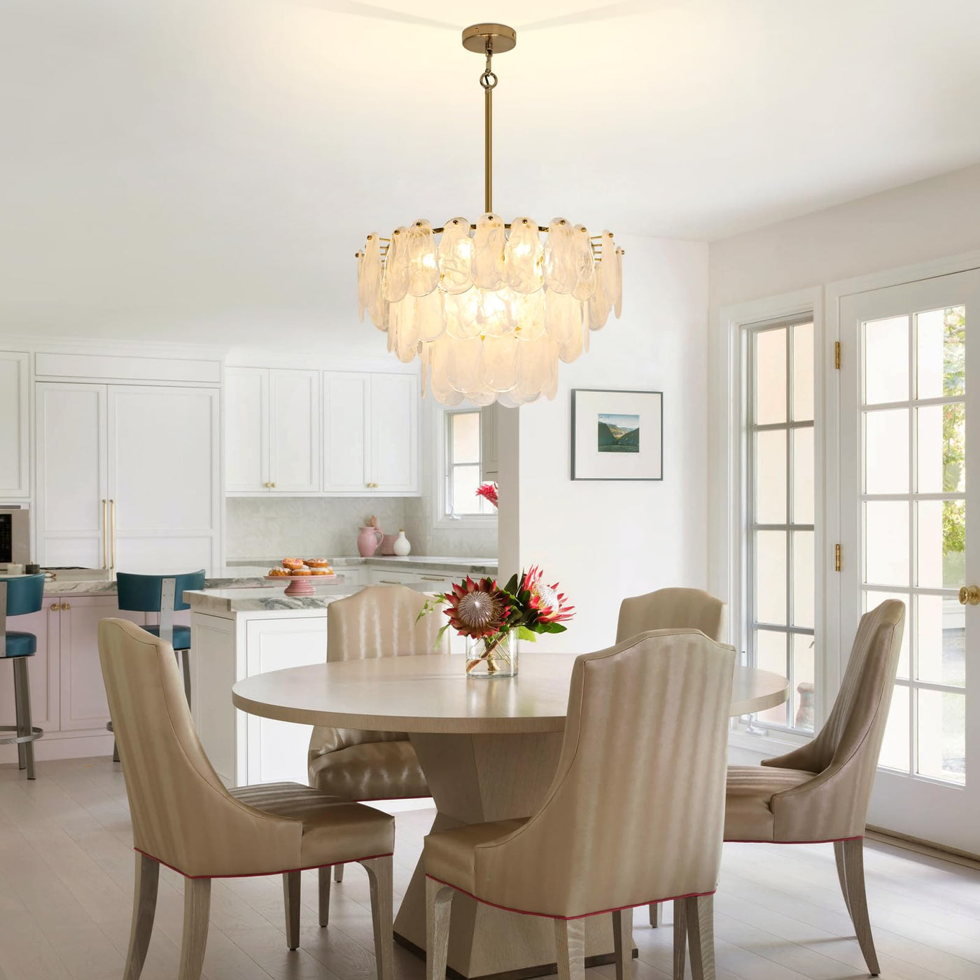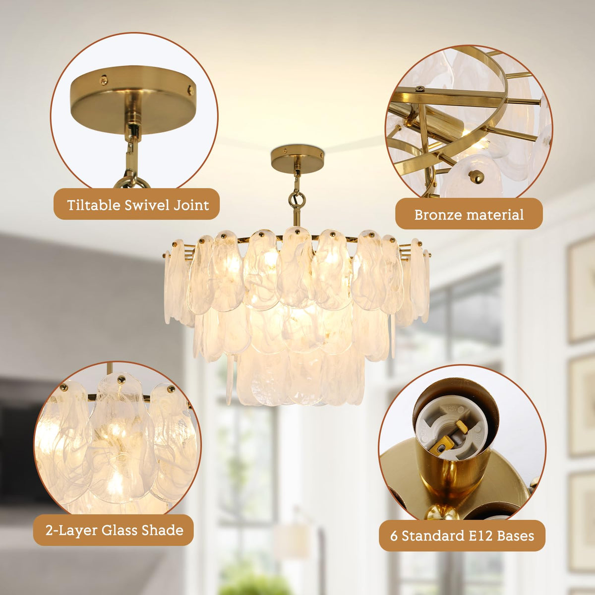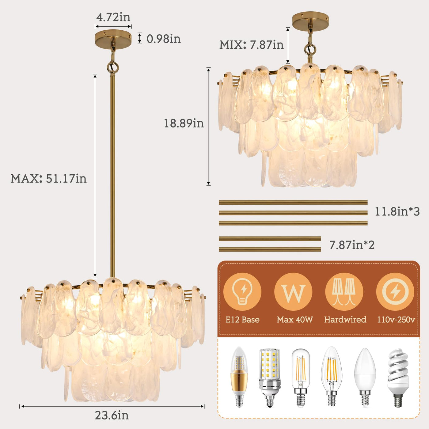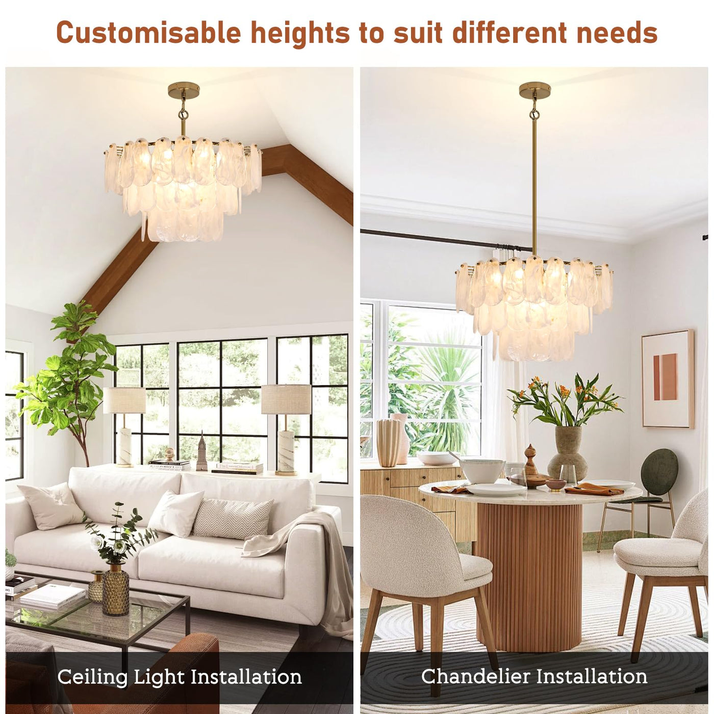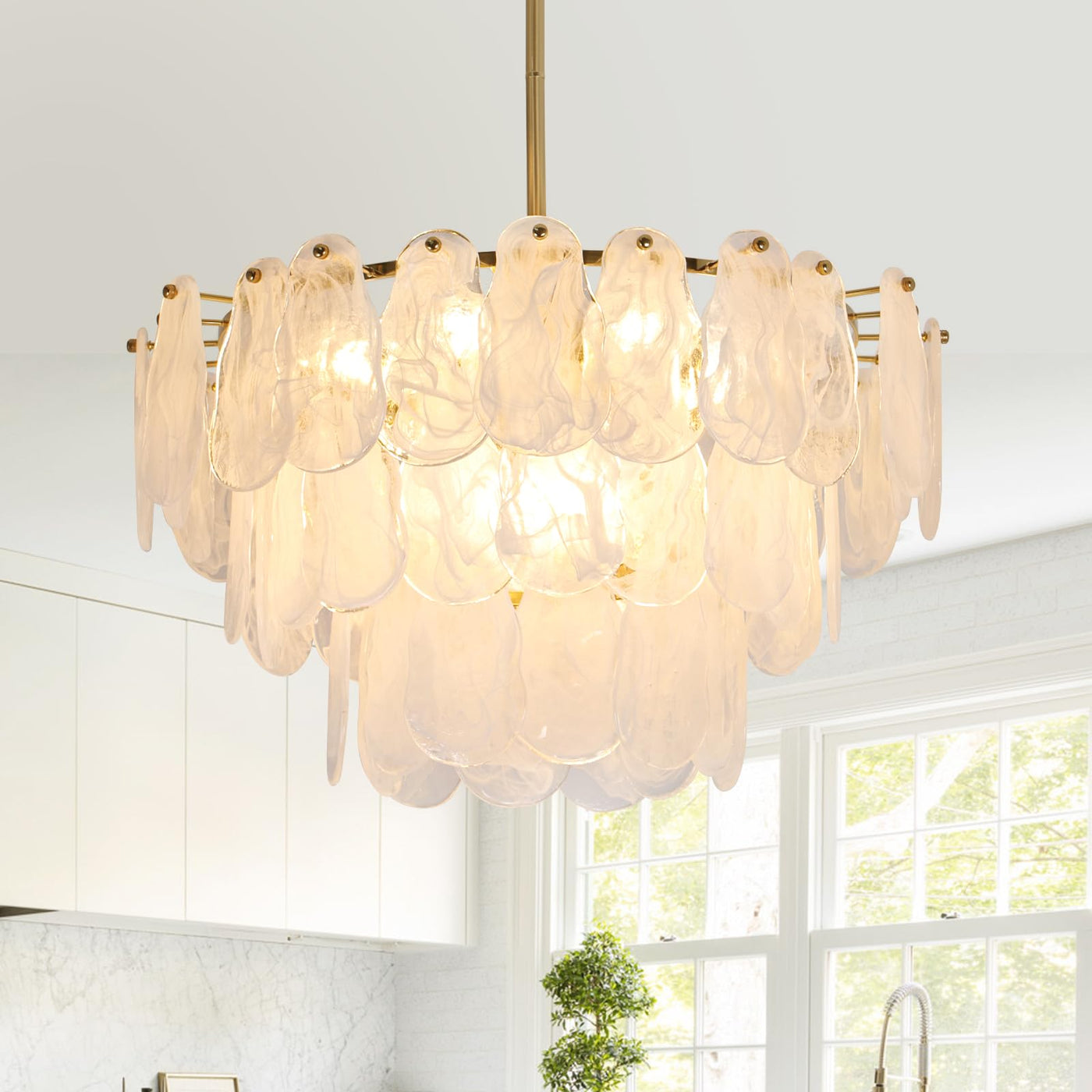 ?Glam & Contemporary?Unique Cloud-Shaped Glass Chandelier.A Focal Point In Your Home, The 100% Handmade Cloud Glass Adds An Even Greater Decorative Touch, And Each Piece Of Glass Is Unique, Mimicking The Shape Of The Clouds In The Sky, Creating A Coastal Style. The Absence Of Harsh Light Creates A Luxurious Atmosphere Of Sophistication And Elegance. | ?Elegant Crystal Chandelier Dimension?Farmhouse Round Ceiling Light Fixture Body H 11.81'' W17.7'' Adjustable Cord Length: 59''Bulb: E26*6Lamp, Compatible With Incandescent, Led, Cfl And Halogen (Bulb Not Included) For Use With Dimmable Bulbs And Compatible Dimmer Switches Fully Dimmable. | ?Easy To Install ?Dining Room Crystal Chandelier Hardwired To Provide A Convenient Combo Connector To Make The Wire Easy To Assemble. With Different Display Devices, There May Be Slight Color Differences, We Promise To Show The Pictures Closest To The Real Thing, Please Be Considerate. | ?Height Adjustable?This 6 Lights Chandeliers For Dining Room Comes With 5 Extension Rods (7.87*2+11.81*3). Adjustable Hanging Height, You Can Adjust The Hanging Height As You Need, Perfect For Low And High Ceilings. The Maximum Hanging Length Is 51.17 Inches. This Modern Dining Room Chandelier Over Table Is Also Suitable For Sloping Ceilings. Meet Your Different Needs | ?After-Sales Service?We Are Proud Of The Quality Of Our Chandelier. If You Have Any Question About Your Purchase, Please Feel Free To Contact Us Because Our Number One Goal Is Customer Satisfaction And We Are Committed To Make Everything Right For You. We Hope To Win A Loyal Customer Base For The