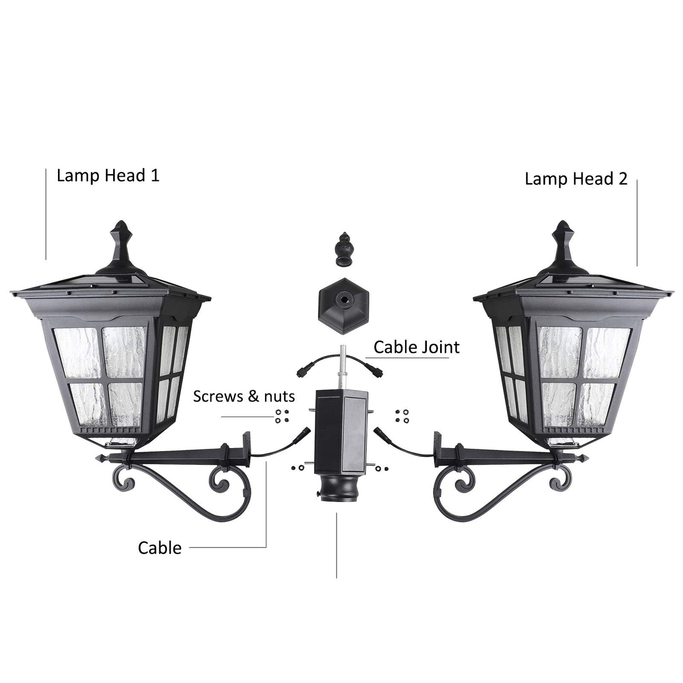 Size: 1 Pack 95(H) x 26.7(L) x 8.8(W) INCH / 241 x 68 x 22.3 CM1 x Kemeco DOUBLE-HEAD solar lamp post light ST4311AB1-23 x Rechargeable batteries in each lamp head1 x User Guide manualSpecification:Color: BlackLED color: Warm WhiteSolar cells: Monocrystalline solar cellsRechargeable Ni-MH battery: AA 1.2v 2300mahPower Switch: ON/OFF buttons on both lamp headsNotes:This product will have a better performance when you set it in a sunny area with full sunlight. The number of hours the light stays on depends on your geographical location, weather conditions, and seasonal sunlight availability. Extreme cold weather also has a marked impact on battery capacity.Please charge your solar light for 24 hours before turning it on for the first time use.Warranty:This product guarantees three years warranty (excluding the batteries). Should a defect occur within the warranty period, please send a message through customer service.