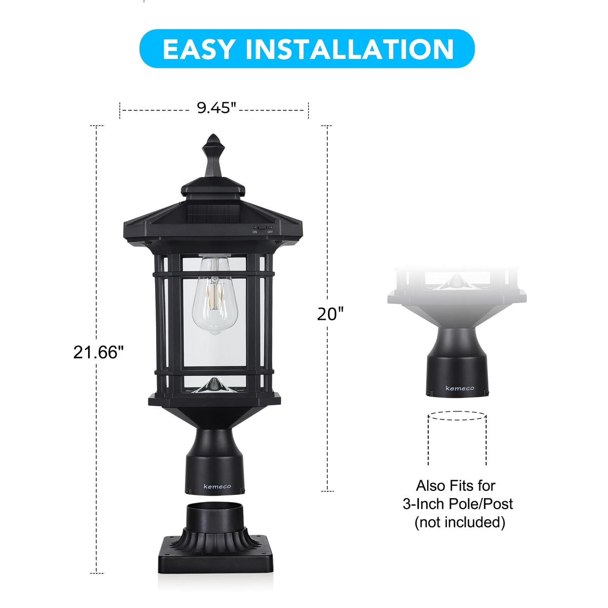 1 Pack: 9.45(W) X 9.45(L) X 21.66 (H) Inch / 24 X 24 X 55 Cm1 X Kemeco Outdoor Solar Post Light St4338Q 3 X Ni-Mh Batteries Included1 X User Guide Manual2024-08 New Version:Lamp Color: Blackled Color: Warm Whiteled Type: Input Voltage Dc 3V (Socket Base E27)Power Switch: External On/Off Slide Buttonnotes:Post Light Is Equipped With Solar Panels That Charge During The Day And Automatically Light Up At Night, Providing A Reliable And Energy-Efficient Lighting Solution. It Is Very Easy To Install, Making It An Excellent Choice For Anyone Looking To Add Lighting To Their Outdoor Space Without The Hassle Of Traditional Wiring.Tips:Solar Light Will Have A Better Performance When You Set It In A Sunny Area. The Lighting Performance Depends On Your Geographical Location, Weather Conditions, And Seasonal Sunlight Availability, Normally 6-9 Hours Or More. Extreme Cold Weather Also Has A Marked Impact On Battery Capacity.For First-Time Use, Please Charge The Light For 24 Hours Before Turning It On.