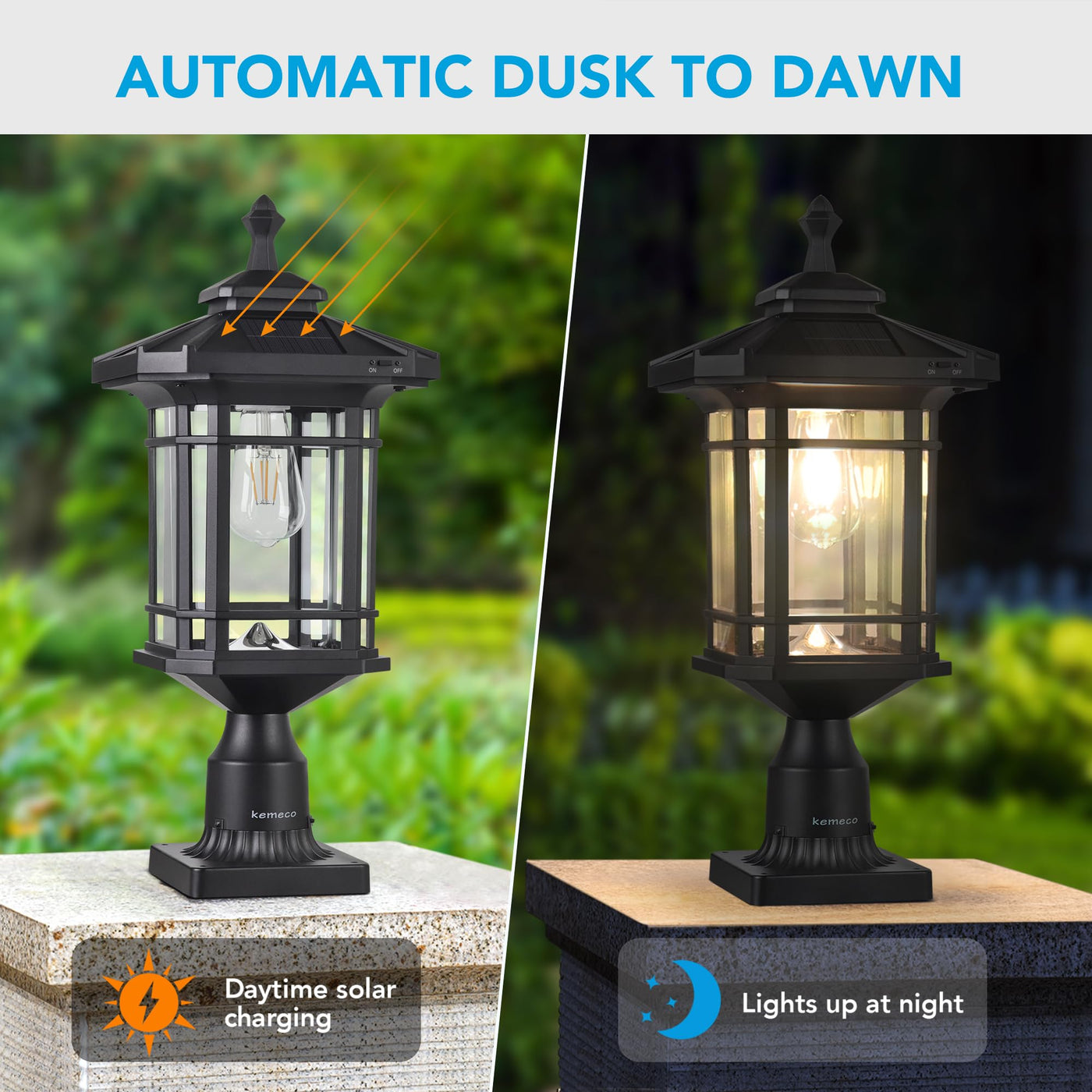 Q: How does the Kemeco Solar Post Light work?A: The Kemeco Solar Post Light operates on 100% solar energy. It features top-mounted solar panels that charge the built-in rechargeable batteries during the day. The lamp automatically turns on at dusk and off before sunrise, providing convenient illumination without the need for electrical wiring.