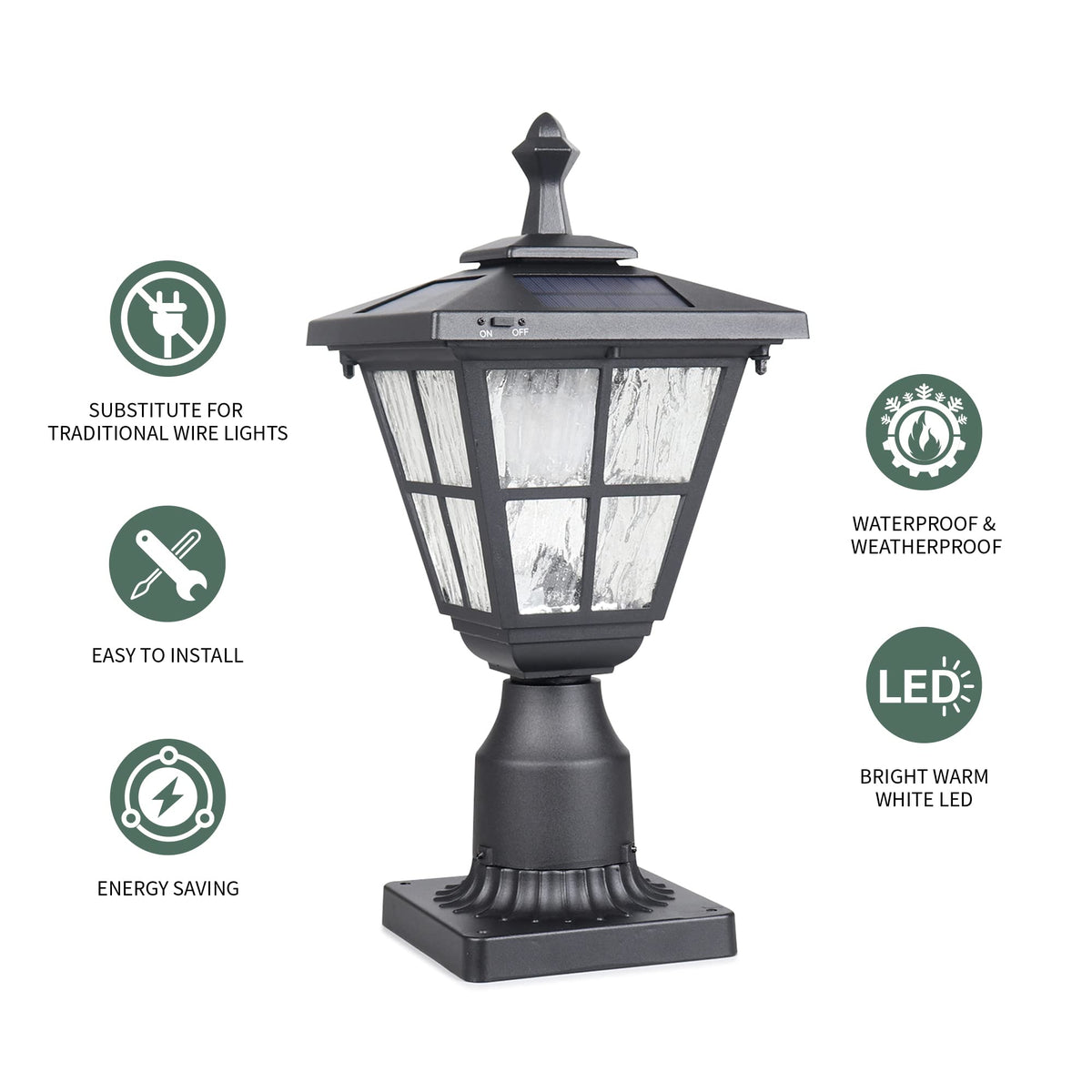 Size: 1 Pack 16.4 (H) x 7.63 (L) x 7.63 (W) inches1 x Kemeco Solar Post Light ST4325Q3 x rechargeable battery1 x User ManualSpecification:Color: BlackLED Color: Warm WhiteSMD LED Quantity: 12Rechargeable Ni-MH Battery: 1.2v 2300mAhPower Switch: ON/OFF Mounting Base Dimensions: 3.12 (height )x 5.5 x 5.5 (inner length) inchesNotes:This product will have a better performance when you set it in a sunny area with full sunlight. If you place the solar lamp in the shade, batteries will not be charged enough, so the lamp will come on for a shorter amount of time. The number of hours the light stays on depends on your geographical location, weather conditions, and seasonal sunlight availability, normally is 6-8 hours in good condition.Please charge your solar light for 24 hours before turning it on for the first time use.Warranty:This product guarantees one year warranty (excluding the battery/batteries). Should a defect occur within the warranty period, please send a message through customer serviceKemecolighting