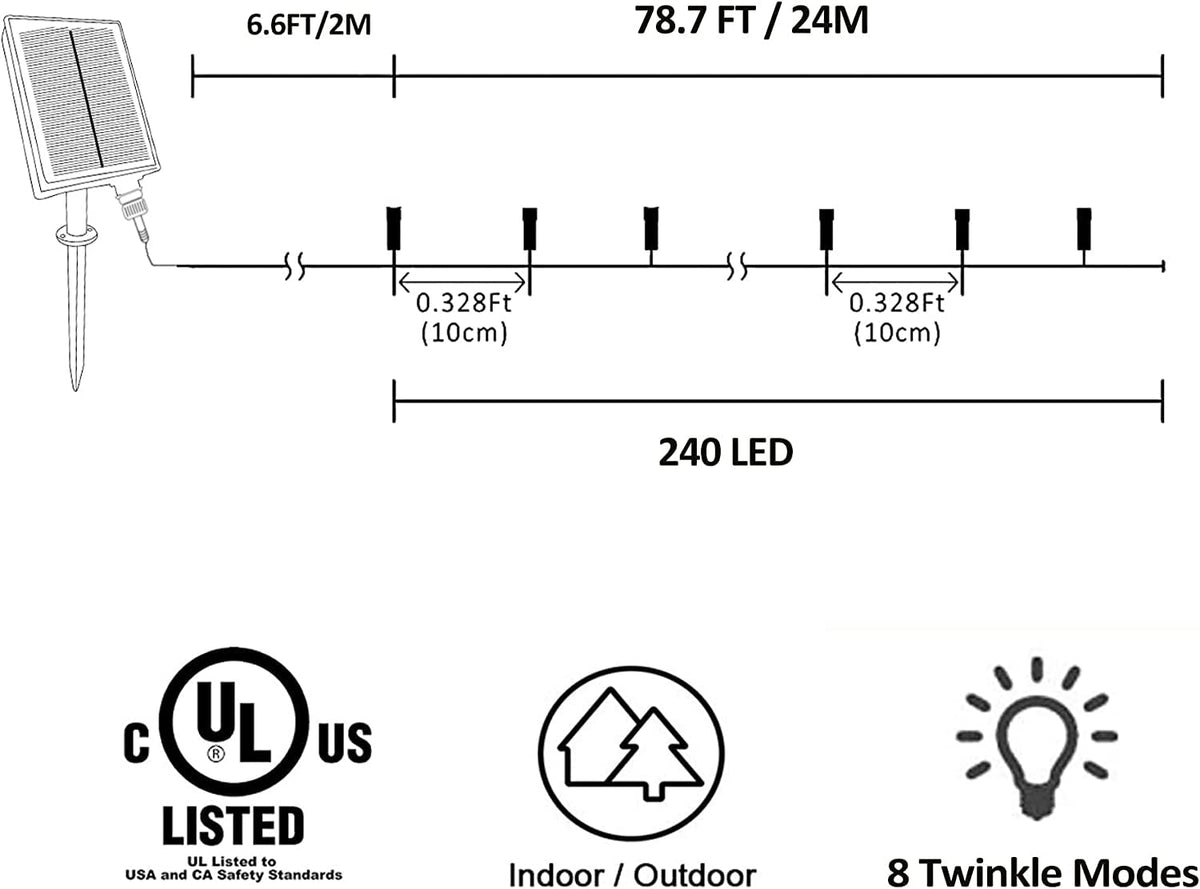 Q: What are the different lighting modes available for these solar string lights?A: These solar string lights offer 8 different twinkle modes, including combination, in waves, sequential, slogs, chasing/flash, slow fade, twinkle/flash, and steady on, allowing you to customize the lighting for various occasions.