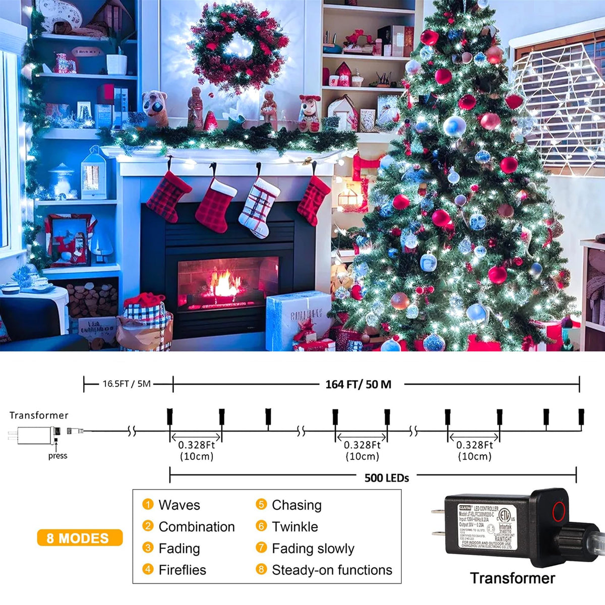 Kemooie 500 Led Christmas Lights, 164Ft 8 Lighting Modes Plug In Waterproof Extra Long Fairy Lights For Outdoor Christmas Tree Lights Birthday Wedding Party Garden Balcony Decoration (White)