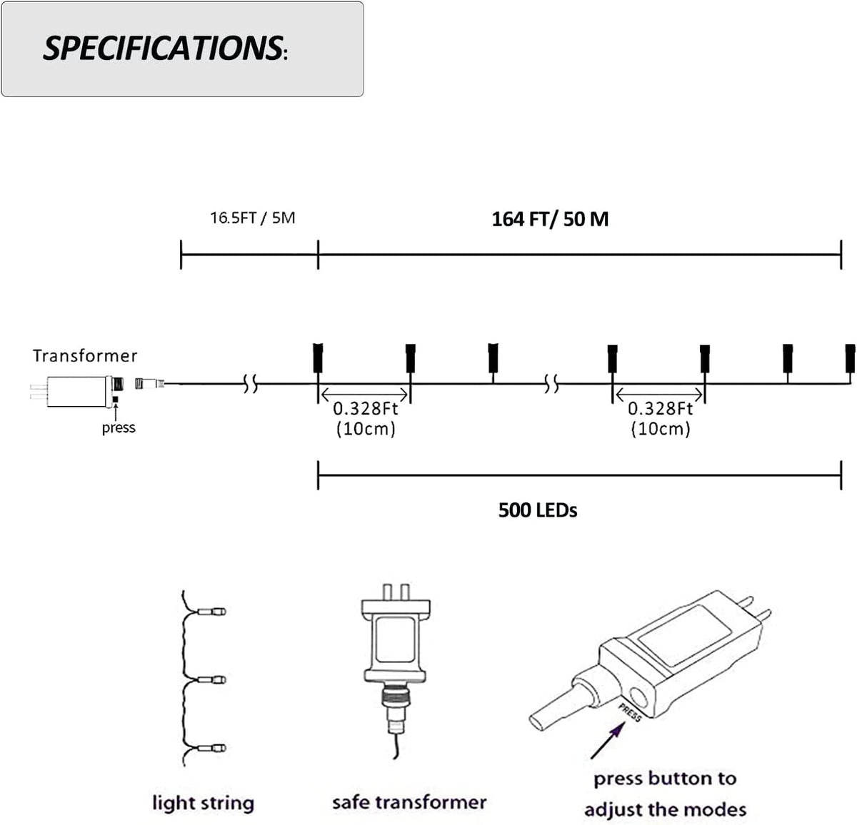 Q: What is included in the package when purchasing these lights?A: The package includes 1 x 500 LED String Lights and 1 x Manual to help you set up and use the lights effectively.