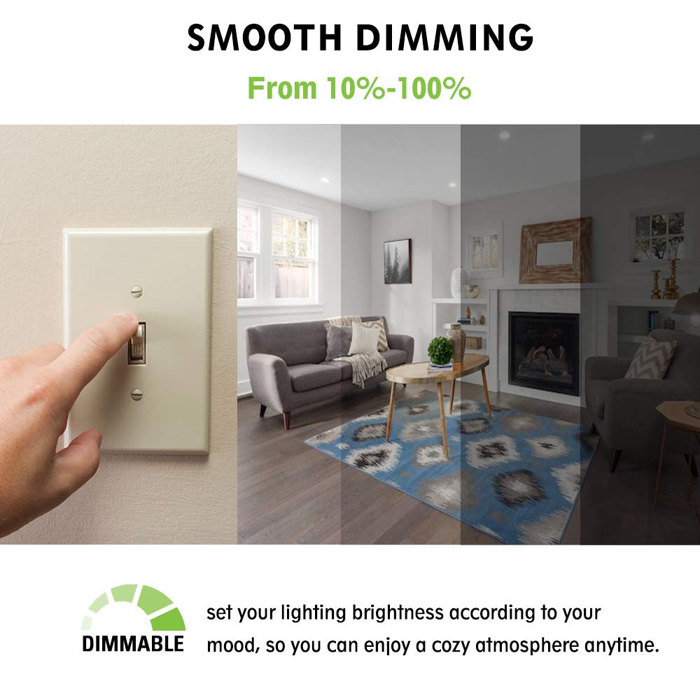 Smooth Dimming: Experience seamless dimming capabilities from 10% to 100% to cater to your specific brightness needs. These bulbs are compatible with a wide range of US-brand LED dimmer switches.