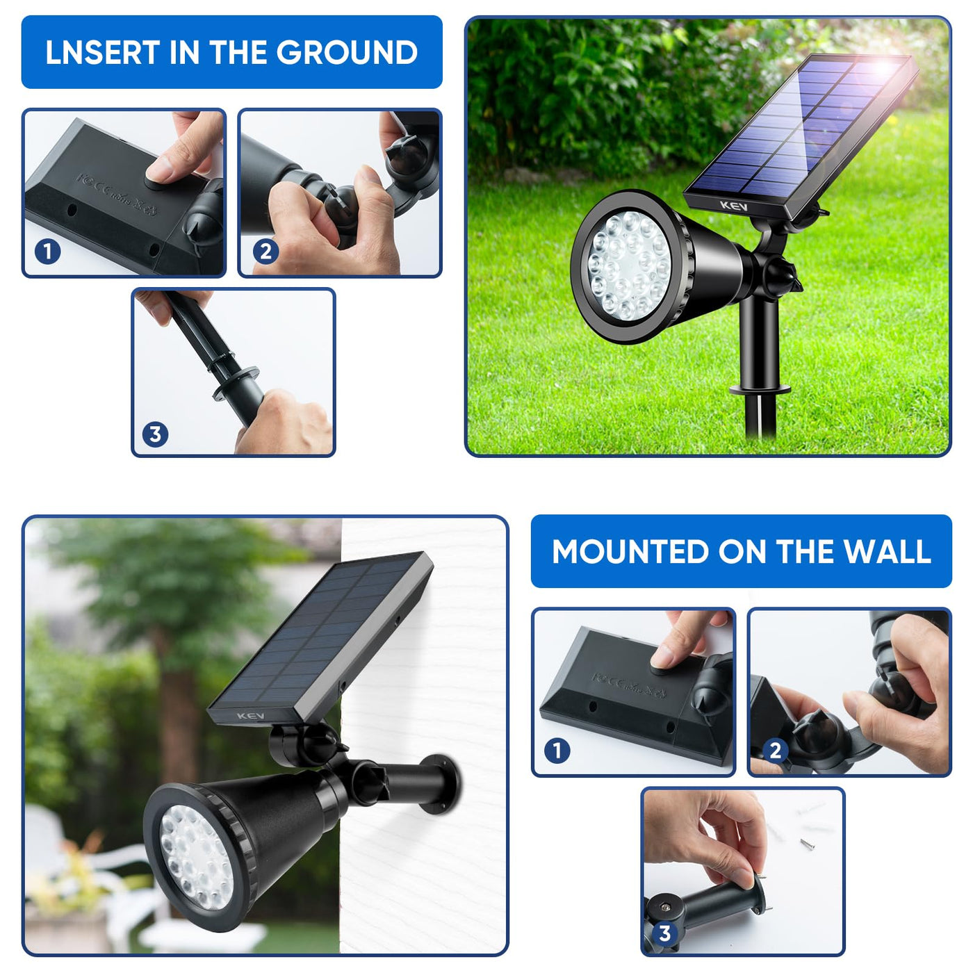 Q: Are these solar spotlights waterproof?A: Yes, the KEV solar spotlights are rated IP65 waterproof, which means they are designed to withstand rain and snow, making them ideal for outdoor use.