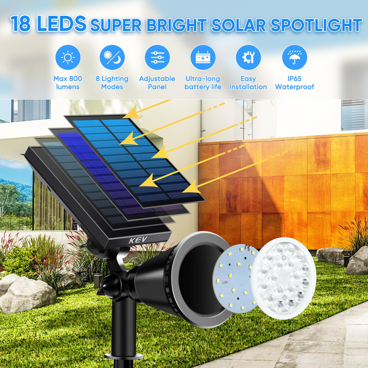 Kev 800 Lumens Solar Spot Lights Outdoor,18 Leds Solar Flood Lights With 2 Modes &Adjustable &Ipx65 Waterproof,Solar Spotlight F