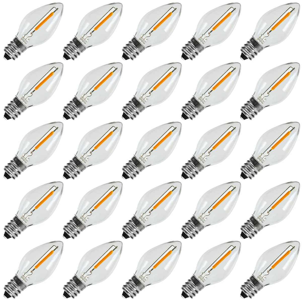 KGC 25Pack C7 LED Christmas Light Bulb, E12 Base Waterproof LED Bulbs for String Light, 2200K Warm White 50LM, Clear Plastic Night Lights C7 LED Replacement Bulbs for Christmas String Lights.
