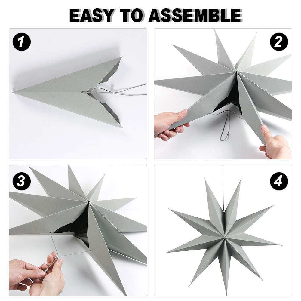 ?Material: Paper. ?Size: 30Cm / 12Inch. ?Color: Grey, Black, White ?Package Included:3 Pcs 9 Pointed Paper Star Lanterns ?Made Of High Quality Thick Paper,Very Sturdy,Won'T Rip. ?30Cm /11.8Inches Folded Size: 15 Cm*6.5 Cm.Come With 3 Colors:Grey, Black, White. ?No Assembly Required, Just Pull Strings Together. Reusable And It Does Not Occupy Space, Easy To Place. ?The Folded Star Ornaments Expand Into A 3D Paper Lanterns.They Can Work With Some Colorful Led Light To Decorate Your Home, Party, And Holiday. ?Beautful Stars For The Coming Christmas,Perfect For Wedding D Cor,Home D Cor,Party Supplies And Shop Decoration, Table Center Pieces And Much More.You Can Hanging On Wall, Ceiling,Christmas Trees Top,Porch Or Anywhere You Like. ?Paper Lanterns Are An Economical Decor, Reusable And It Does Not Occupy Space, Easy To Place.