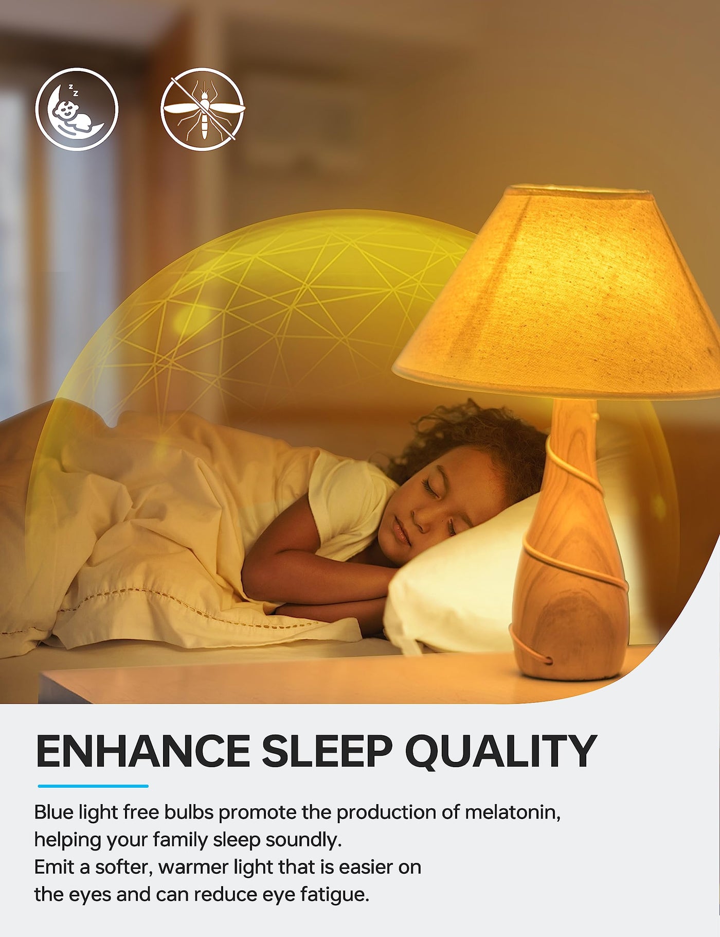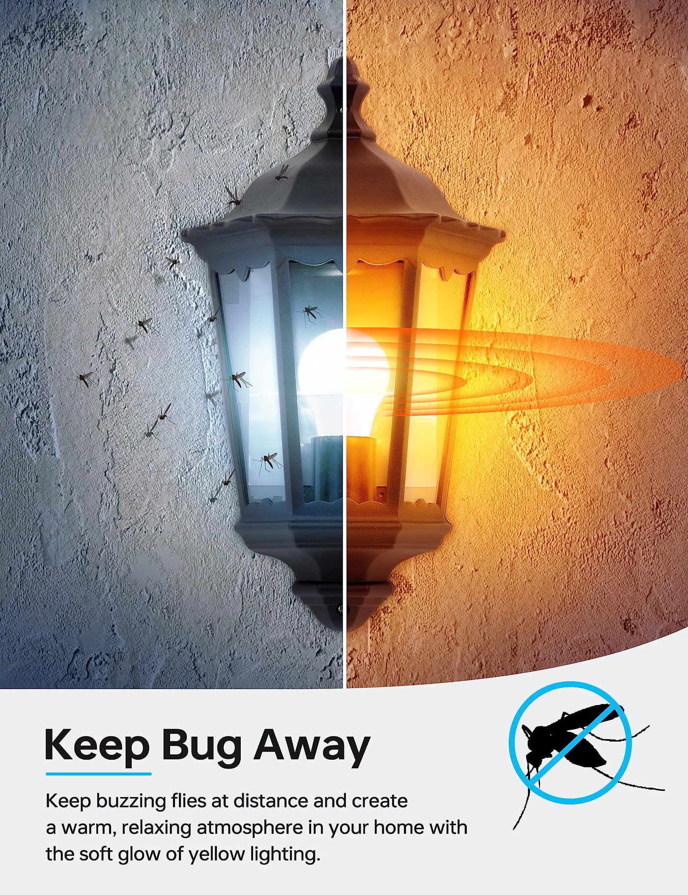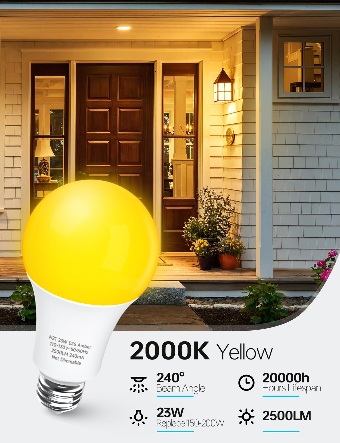 Bug Light Bulbs: Emitting a special no-blue yellow light spectrum, our A21 LED bug light bulbs keep bugs away to a certain extent, making your summer outdoor time without buzzing and more comfortable | Enhance Sleep Quality: With a 2000K no-blue glow, our yellow LED light bulbs create softer and warmer lighting, helping you feel relaxed and creating a cozy atmosphere for better sleep. Amber light bulbs can be used in the outside patio, deck, patios, backyard, living room, bedroom or anywhere you need pleasant and relaxing lighting | Home or Party Decoration: Standard E26 base socket is easy to install and fits most light fixtures. Our yellow bug light bulbs are suitable for any party decoration, home lighting, holiday lighting, or decorative lighting. Create more artistic lighting for your life and bring any party to life | Low Consumption & Long Lifespan: 23W LED bulbs replace 150-200watts equivalent incandescent light, saving up 85% energy and reducing your electricity bill. The average service life is 20,000 hours, which reduces the frequency of lamp replacement. Enjoy artistic yellow lighting without the high electricity bills | Safety and Reliablity: These outdoor yellow bug light bulbs are no UV or IR no lead or mercury. And please noted that our bug light bulb has a white casing, but it emits a yellow light once illuminated