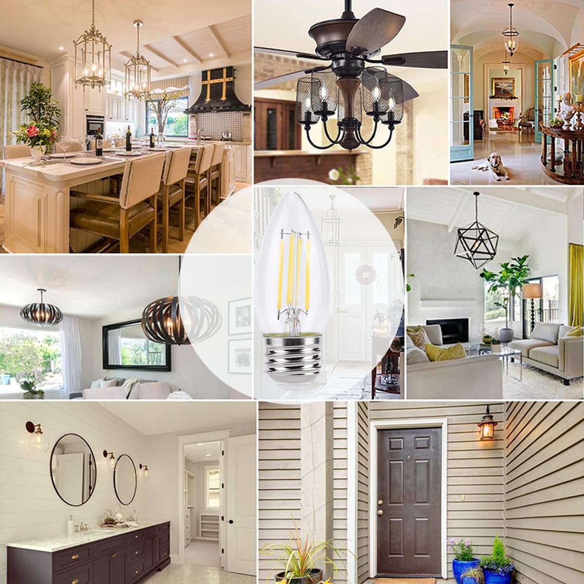 kinur candelabra led light bulbs, 4 watt led power used to replace candelabra light bulbs 40 watt and candelabra light bulbs 60 watt,give off soft and comfortable lighting with 90+ high cri. kinur e26 led bulb can help reduce emotional and mental stress. it can help people to relax and fall asleep faster.kinur candelabra led light bulbs can last up to 25,000 hours, providing long-term use and making it virtually maintenance-free.chandelier light bulbs do not contain mercury and do not release any hazardous gasses, or chemicals. Our e26 bulb can be used for festival decorate, restaurant, halloween parties, valentines day, birthday parties, bars, etc.