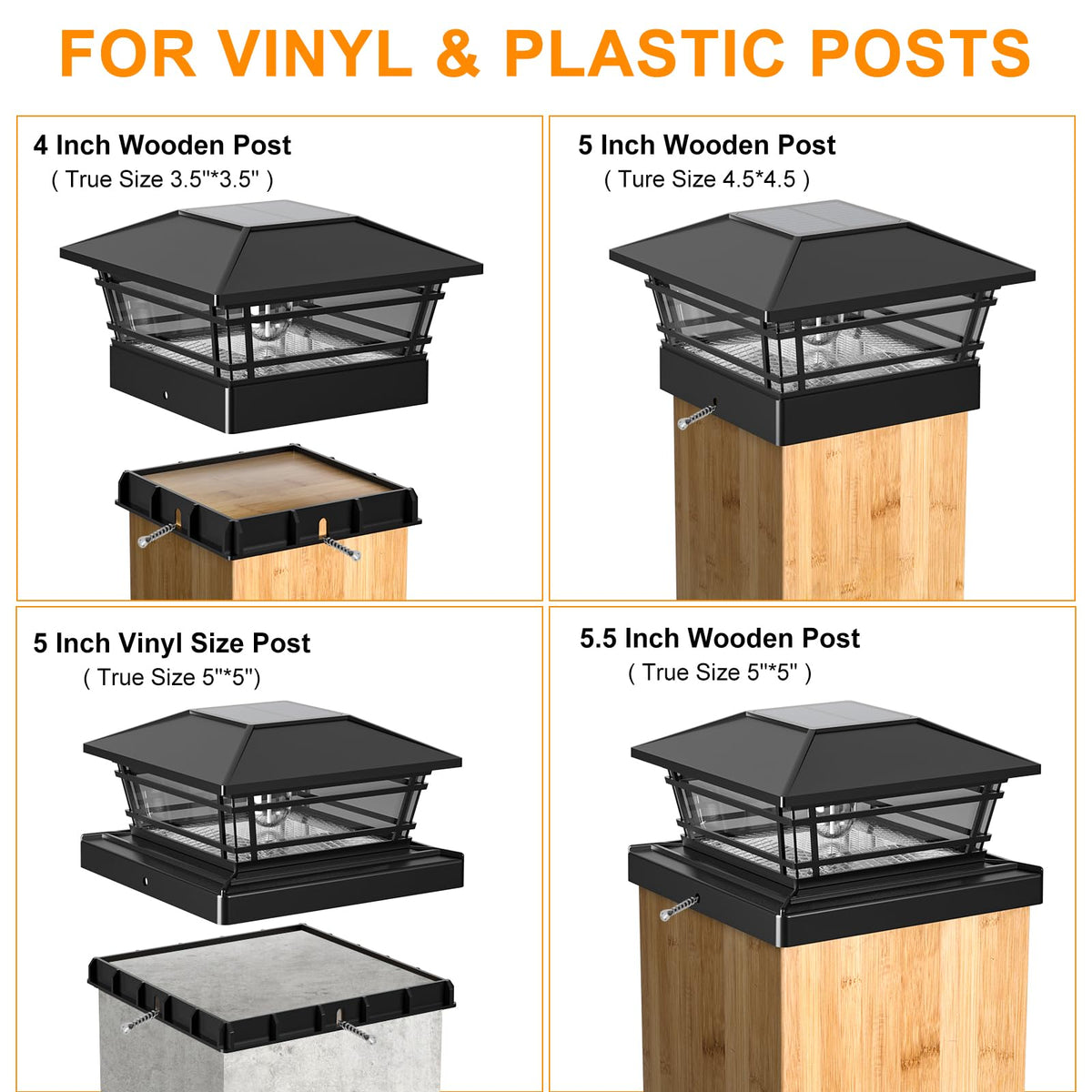 Q: Are these solar post lights easy to install on different sizes of fence posts?A: Yes, the Kipeini Solar Post Cap Lights come with various base sizes and can be easily installed on standard true size posts measuring 3.5"x3.5", 4"x4", 5"x5", and 5.5"x5.5".