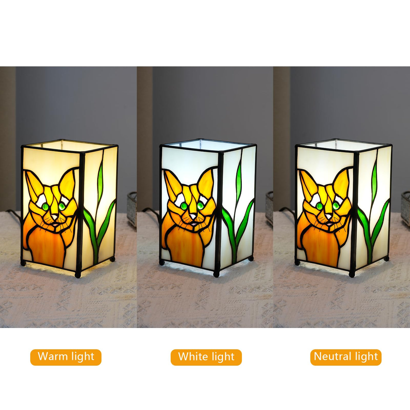 Tiffany Style Lamp: Full Of Mid-Century Style And Exquisite Design. It Can Be Used For Decades Without Discoloration Or Fading. Small Table Lamp Dimensions: 3.5 L X 3.5 W X 6.35 H Included E12 Warm Light White Cool White 3-Color Dimmable Light Bulb. You Can Use Glass Lamp For Placing Bedside Bedroom Living Room Kids Room And Rustic Spaces. They Have Vintage Look Create Invites To Relax And Rest Ambient. Real Stained Glass Lampshade Handmade Cat Table Lamps It Is Not Only For Home Decoration But Also Can Be Used As A CollectorS Item. Add Elegance And Creativity To Your Home. If You Have Any Questions About The Lamps Please Contact Us In Time We Will Give You A Satisfactory Solution.