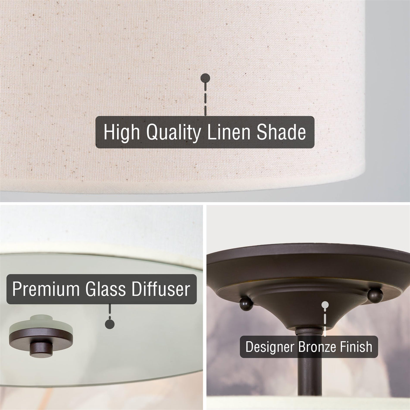 This semi flush mount light features a classic design with a sophisticated oil rubbed bronze finish and a enhanced glass diffuser. The linen fabric drum shade emits a bright and inviting glow, elevating the decor of any room. Its versatile style complements a wide range of interior designs, from minimalist to traditional, ensuring it fits seamlessly into your home.