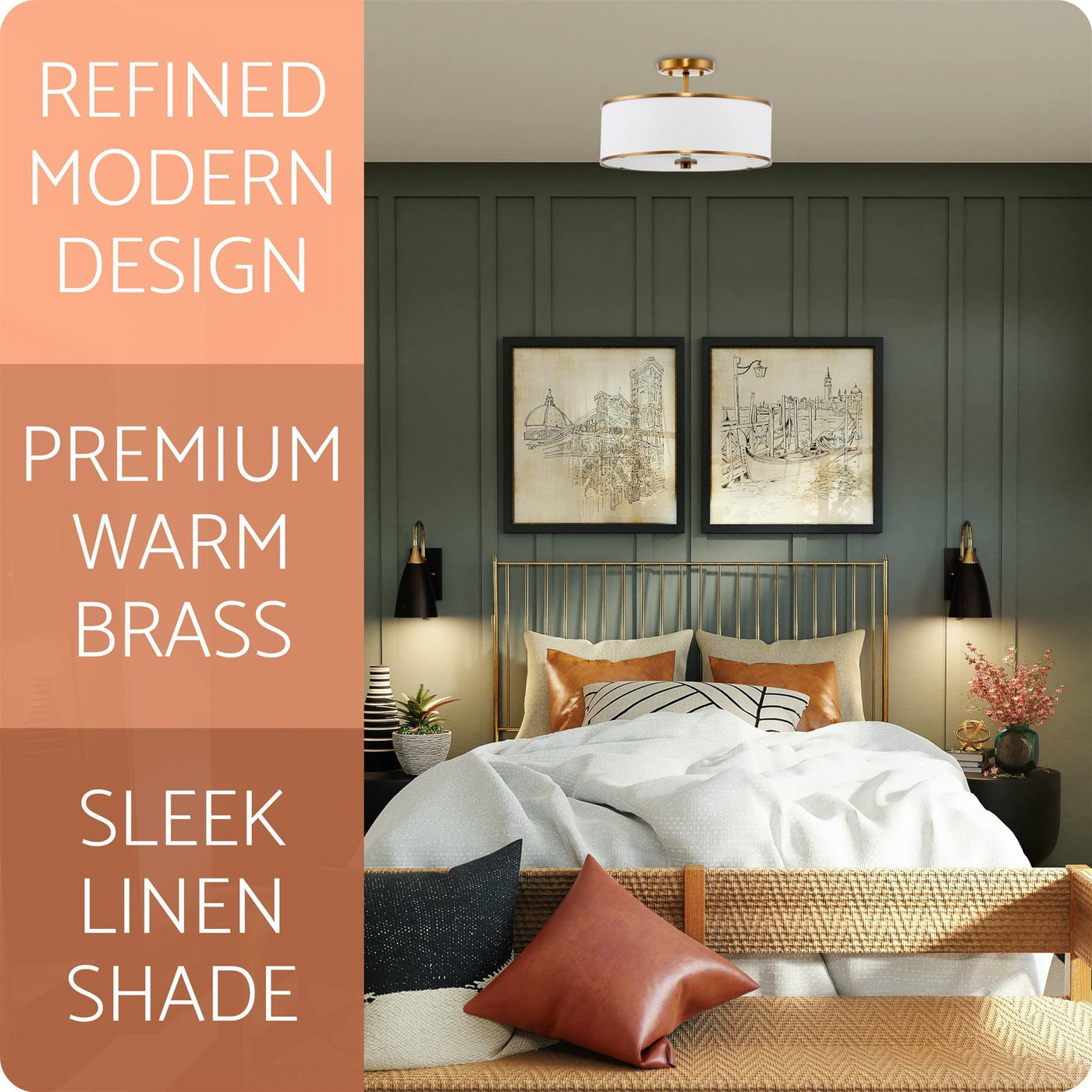 Crafted with a enhanced white linen fabric drum shade, the Chloe semi-flush mount light fixtures provide a soft, diffused glow, creating a welcoming atmosphere in various environments. The removable warm brass trim allows for easy customization, enabling users to adapt the fixtures look to match their decor. Its versatile design makes it suitable for installation in areas such as dining rooms, foyers, walk-in closets, and even hospitality settings like hotels and restaurants. The fixture is compatible with standard dimmer switches and can accommodate LED, CFL, or traditional incandescent bulbs, ensuring flexibility in lighting options.