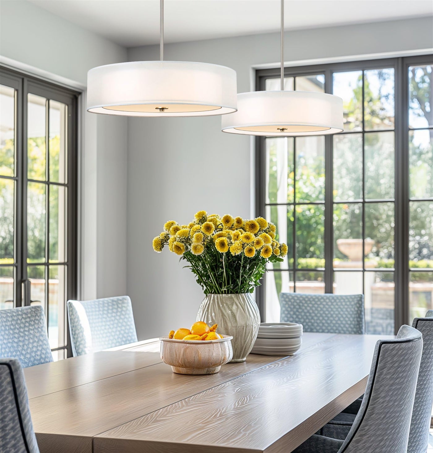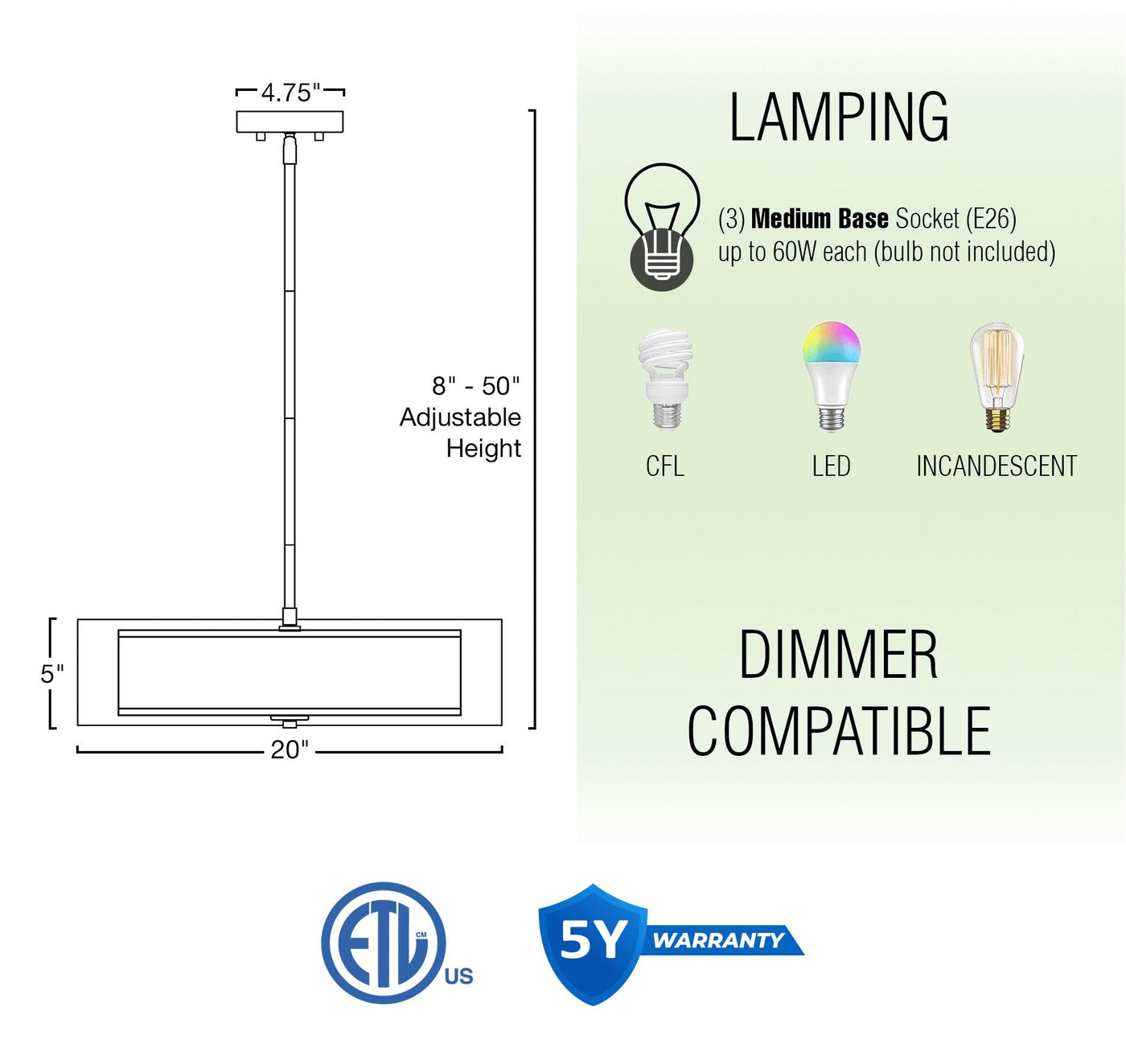 - **Adjustable Dimensions**: With an adjustable height ranging from 8" to 50", the pendant light includes (1) 6" and (3) 12" downrods. The shade measures 5" (H) x 20" (D), while the canopy has a diameter of 4.75", making it a perfect fit for various ceiling heights and room sizes.