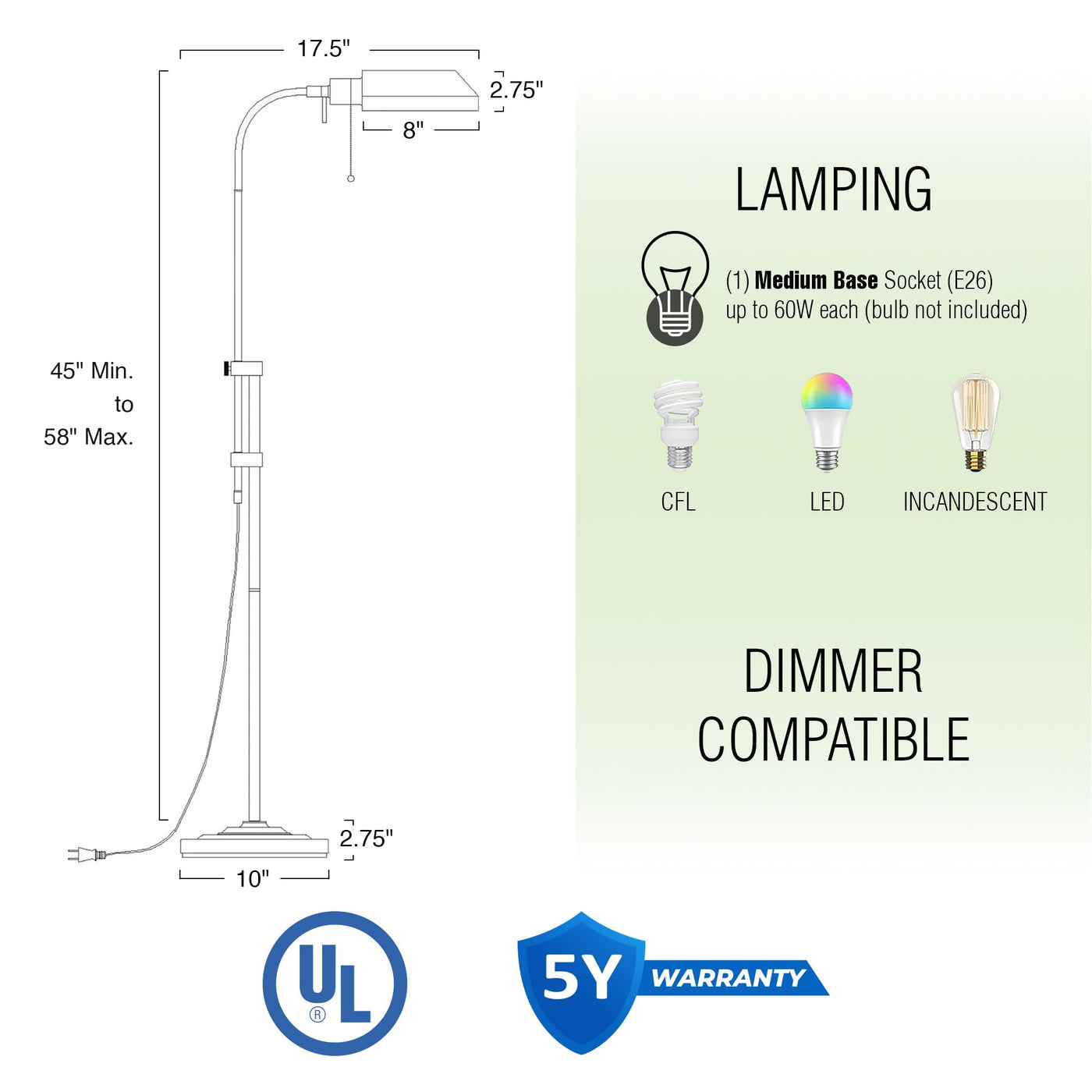 Kira Home'S Prescott Adjustable Floor Lamp Is A Wonderful Addition To Your Home. Featuring A Sleek Brushed Nickel Finish, It Is Sure To Capture The Attention In Any Room. Sleek And Compact, Prescott Will Fit In A Multitude Of Spaces, Providing The Perfect Bright, Task Lighting. It Is Ideal In The Living Room, Bedroom, Library, Entryway, Office Or Den And Its Precise Lighting Makes It The Perfect Choice For All Your Hobbies Such As Reading, Writing, Quilting, Sewing, Jewelry Making, Cross Stitch, Beading, Electric Repair, Tinkering, Arts & Crafts, And Much, Much More! Slender And Refined, Prescott'S Minimalist Style Fits In A Wide Range Of Decor Without Occupying Too Much Valuable Space. Place It In Your Modern Industrial Loft, In Your Classic Traditional Study Room Or In Your Urban Style Apartment. From Vintage To Contemporary, The Prescott Matches Them All! This Standing Floor Lamp Comes With A Long Lasting, Energy Efficient, Power Saving And Environmentally Friendly 6W Led Bulb, 60W Eq. ($12 Value). It Can Easily Be Adjusted From A Height Of 45.75'' To A Height Of 58.25'' To Your Preference. The Lamp Head Moves So You Can Direct Light Where You Wish And It Has A Heat Shield To Prevent Overheating.Prop 65 Warning: Yesprop 65 Harm: Cancer, Birth Defects, And/Or Other Reproductive Harmsprop 65 Chemicals: Leadsafety Rating: Ul Listedlocation Rating: Drylighting Direction: Downlightlighting Source Type: Incandescent, Led, Cflindoor/Outdoor Usage: Indoorbase Type: E26Shade Shape: Rectangularshade Material: Metal