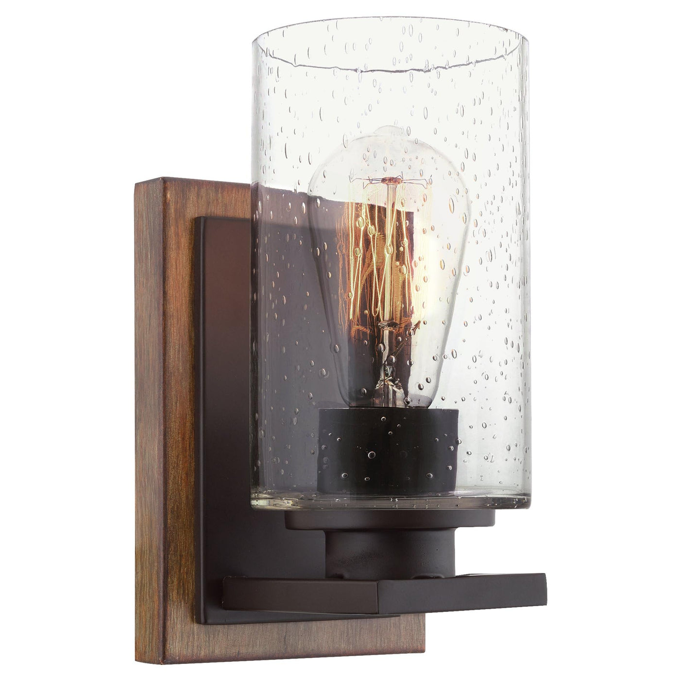 Kira Home's Sedona 9'' rustic farmhouse wall sconce boasts a high quality build and skilled craftsmanship. The warming oil rubbed bronze finish, walnut wood style backplate and bubble glass shade come together to create an exceptionally beautiful wall lamp that blends perfectly in various areas of the home as well as hospitality settings. Place in pairs next to a bathroom or bedroom mirror or in a bar or restaurant. Make a great first impression by placing in a hallway or entryway. Sedona's walnut wood style design is the focal point, giving it a luxurious and high quality look. The classic oil rubbed bronze finish is perfect for multiple areas including modern/contemporary settings, rustic, or modern industrial interior. .Sedona is UL approved for your safety.Prop 65 Warning: YesProp 65 Harm: cancer, birth defects, and/or other reproductive harmsProp 65 Chemicals: LeadSafety Rating: UL ListedLocation Rating: DampIncludes: Mounting HardwareLighting Direction: Up/Down LightLighting Source Type: Incandescent, LED, CFLMounting Style: WallControl By: Wall Light SwitchIndoor/Outdoor Usage: IndoorBase Type: E26Shade Shape: CylinderShade Material: Glass