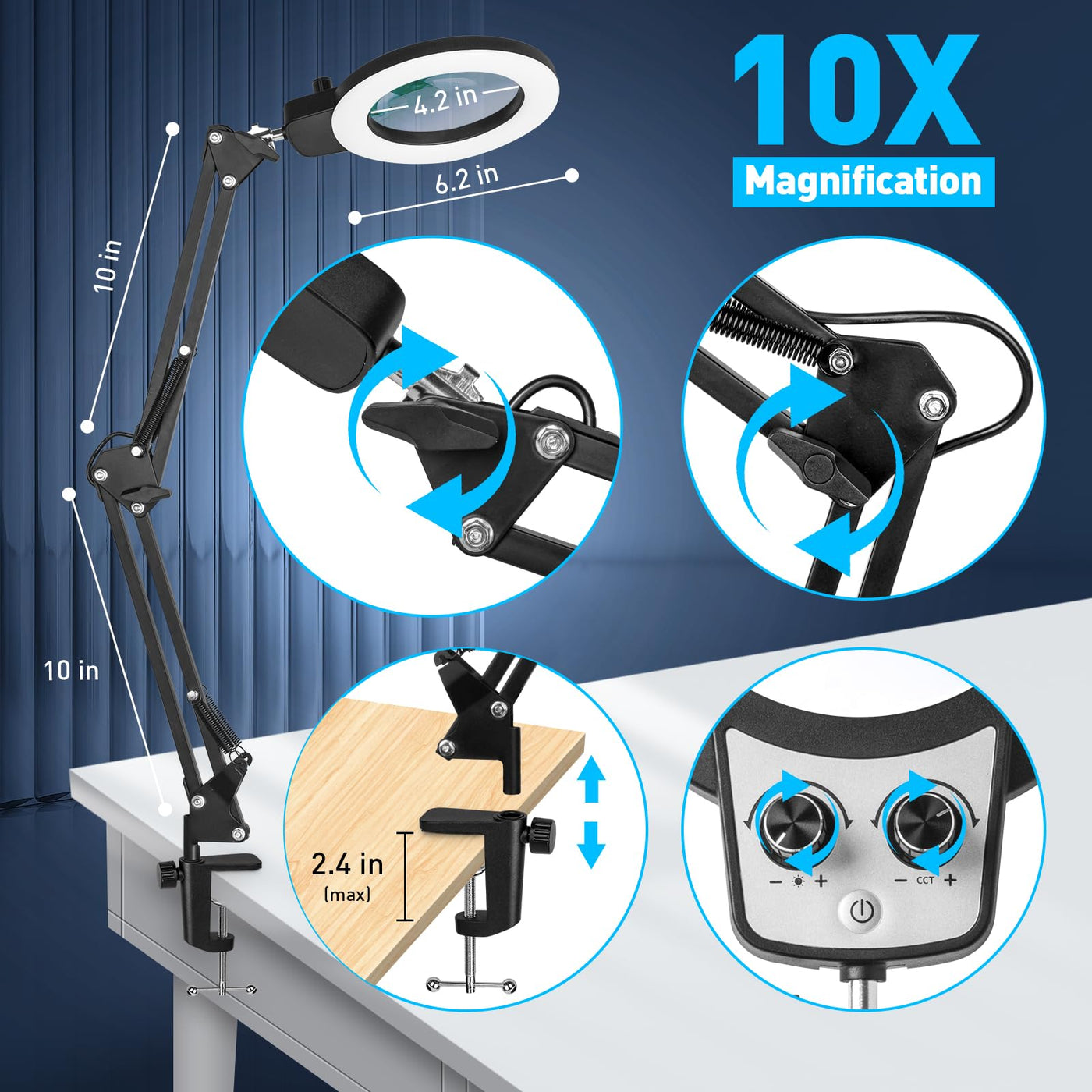 Kirkas 10X Magnifying Glass With Light, Kirkas Any Color Modes & Stepless Dimming Led Magnifying Lamp With Clamp, Hands Free Lig