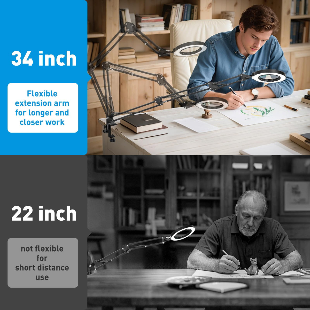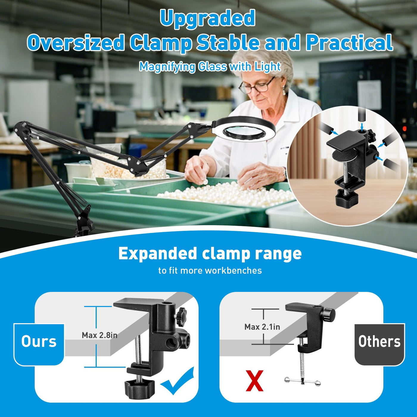 12X Real Optical Glass: This Desk Magnifying Glass With Light Features A 4.2-Inch Hd Optical Lens, Delivering 12X Magnification With Distortion-Free Clarity, Perfect For Precision Tasks. The Eye-Friendly Led Light Provides Soft, Comfortable Illumination, Ideal For Hobbies Like Jewelry Making, Sewing, Crafting, Reading, Painting And Cross-Stitch, It Enhances Focus And Accuracy. Three-Section Super-Long Swing Arm: Three-Section Adjustable Swing Arm Perfectly Solves The Defect Of Short Traditional Arms. It Can Be Extended To 42.5 Inches, Equipped With 3 Knobs And 6 Springs, Which Can Achieve Maximum Extension And Flexibility, Without Moving The Magnifying Glass With Light And Stand Many Times. Magnifying Lamp Can Retract Into A Single-Arm State To Save Space. Two-Way Use Of Large Fixtures, More Stable, Both Vertical And Horizontal Can Be Clamped. 5 Color Modes & 10 Levels Dimming: Magnifier With Light Has 5 Color Modes And Infinite Brightness Level, And You Can Combine Any Lighting Mode You Like At Will. Our High-Quality Led Lamp Beads Have No Stroboscopic Light, Highly Simulate Natural Light, Protect Your Eyes And Reducing Eye Fatigue Caused By Prolonged Observation. We Are Equipped With A 5V 2A Adapters To Provide Stable Current, Protect The Service Life Of The Magnifying Glass With Light And Save Your Money. Convenient Control Button: The Lighted Magnifying Glass Uses The Button On The Top Of The Head To Adjust The Light, Which Is More Convenient. You Can Adjust Any Mode You Want At Will Without Looking For The On-Line Switch Of The Magnifier Lamp. The Memory Function Can Remember The Last Use State And Will Not Interrupt Your Attention. It Is Especially Suitable For Fine Work That Needs Concentration, Such As: Embroidery, Carving, Embroidery, Manicure, Crochet, Electronics Repair. Ideal Gift Choice & After-Sales Service: Break Through The Routine And Give Your Family A Surprise. The 12X High-Definition Optical Glass Equipped With Long Enough Arms, Which Is Beyond The Reach Of Other Products On The Market. With Our Accumulated Experience In Magnifying Glasses And Led Lamps For More Than Ten Years, We Strive For Perfection In Every Detail To Ensure That Every Use Scene Is Comfortable. If You Have Any Questions During Usage, Please Feel Free To Contact Us.