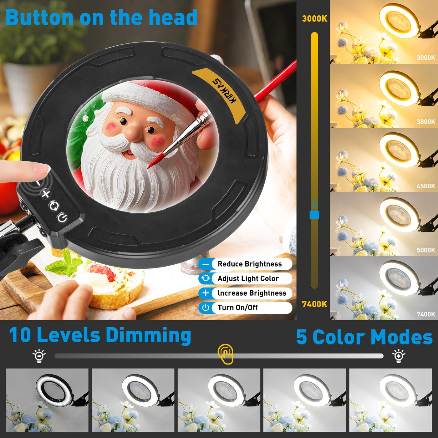 Kirkas 12X Magnifying Glass With Light Large Clamp, Real Glass Lens Lighted Magnifying Lamp, 3 Section Swing Arm And 5 Color Mod