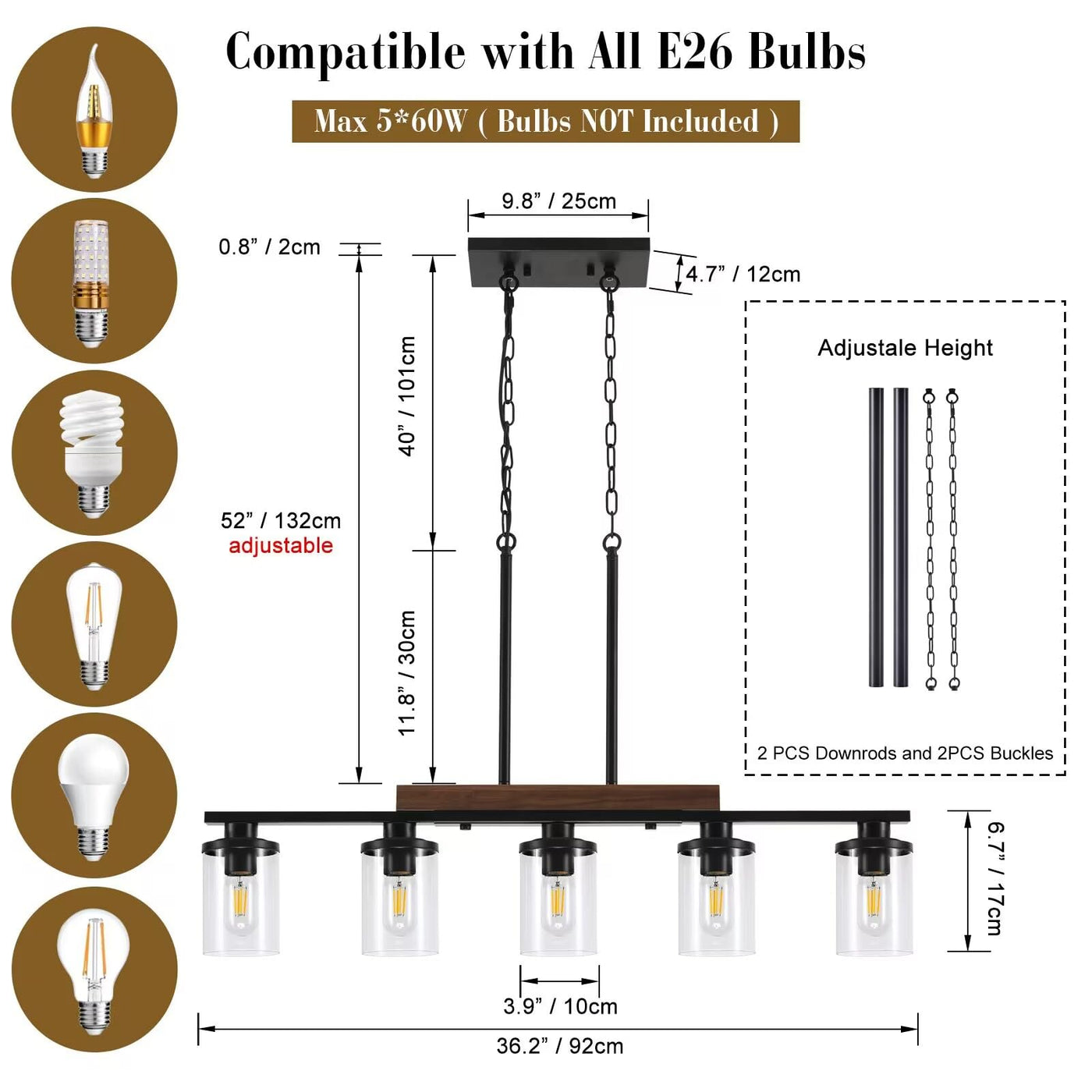 Q: What type of bulbs are compatible with the Kitchen Island Lighting?A: The Kitchen Island Lighting requires 5 E26 bulbs with a maximum power of 60W. It is compatible with CFL, halogen, incandescent, and vintage Edison bulbs, allowing you to enjoy dimmable lighting when paired with a compatible dimmer switch.