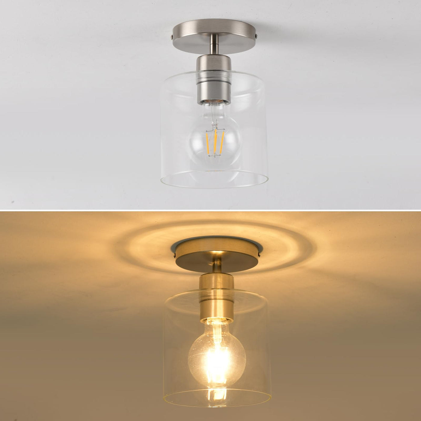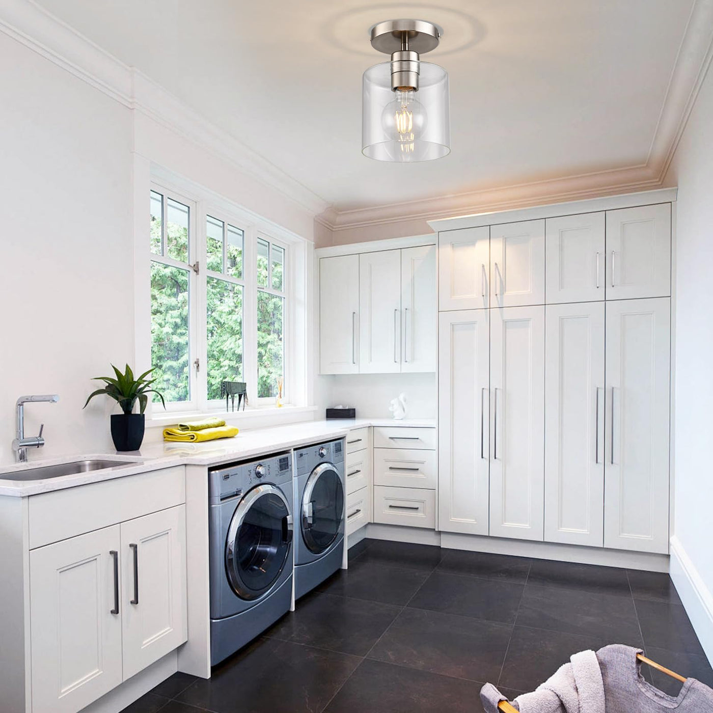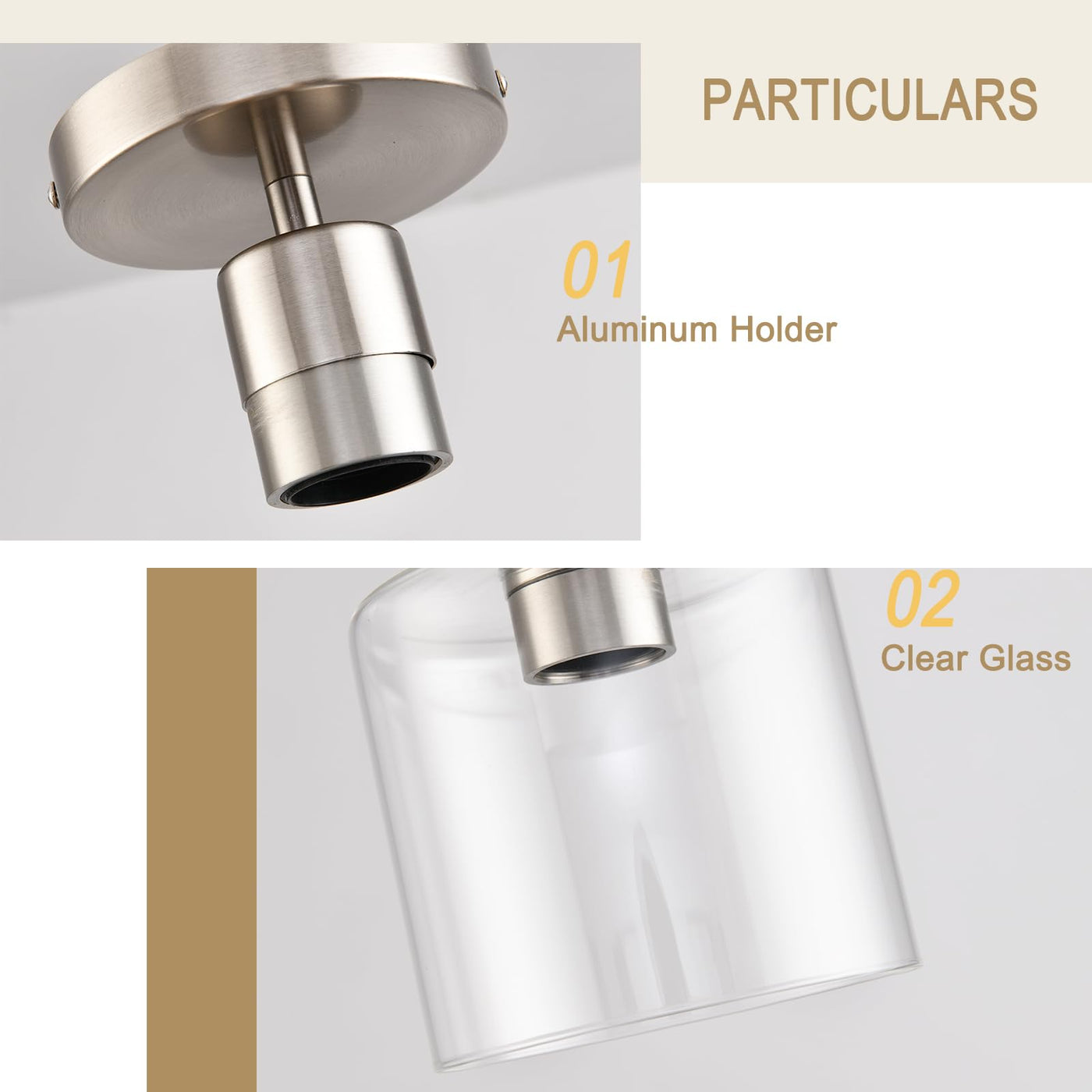 Q: What materials are used in the design of this ceiling light fixture?A: The KLSS ceiling light features a brushed nickel lamp holder with ceiling plate accents, complemented by a shapely clear glass shade. This modern design allows you to easily change the bulb to achieve different aesthetics.