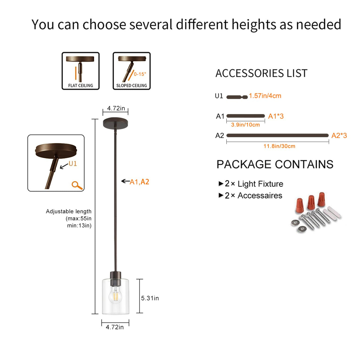 Klss Oil Rubbed Bronze Pendant Lights Kitchen Island - Clear Glass Pendant Light Fixture Multiple Stems Rods 3 Units 12 Inch 3 U