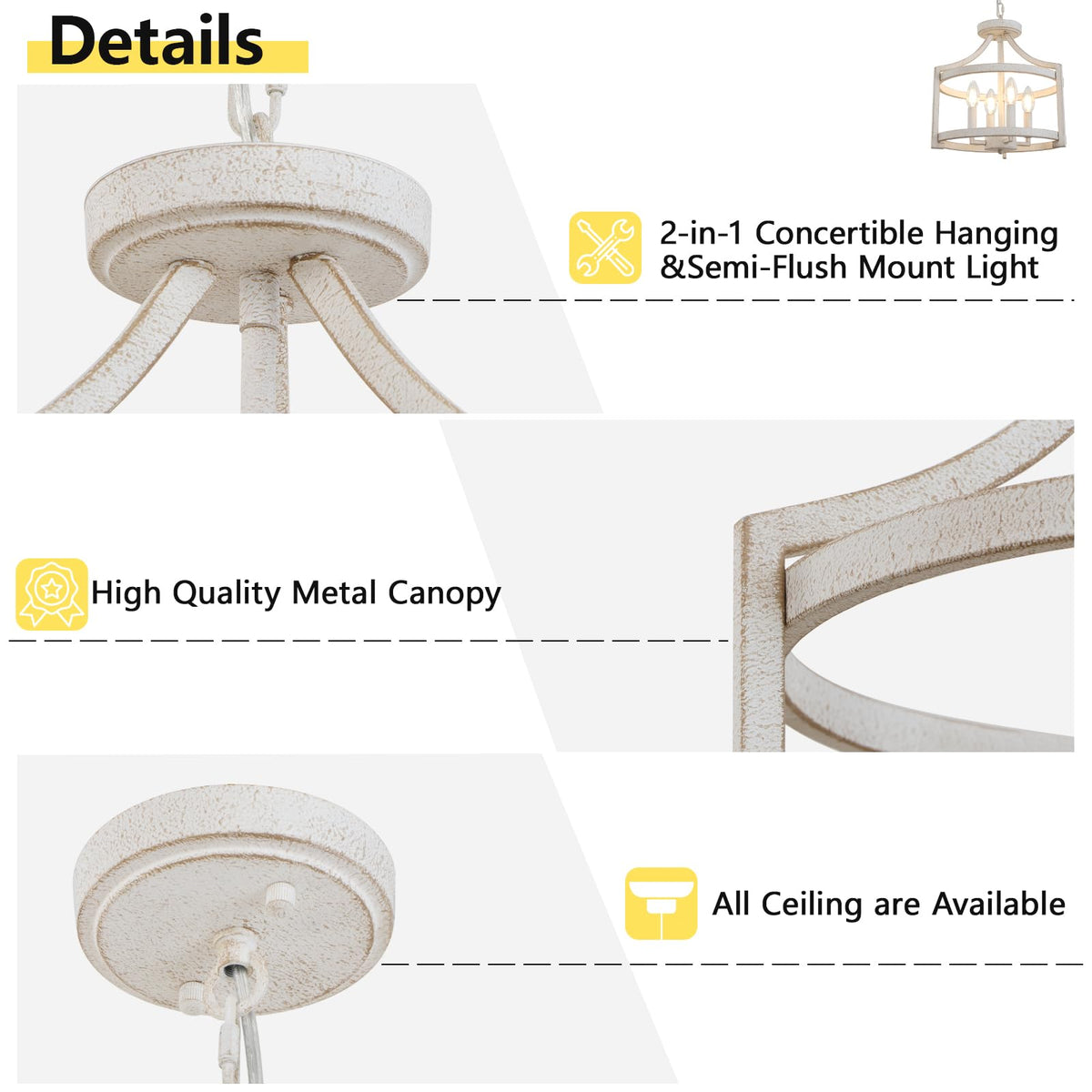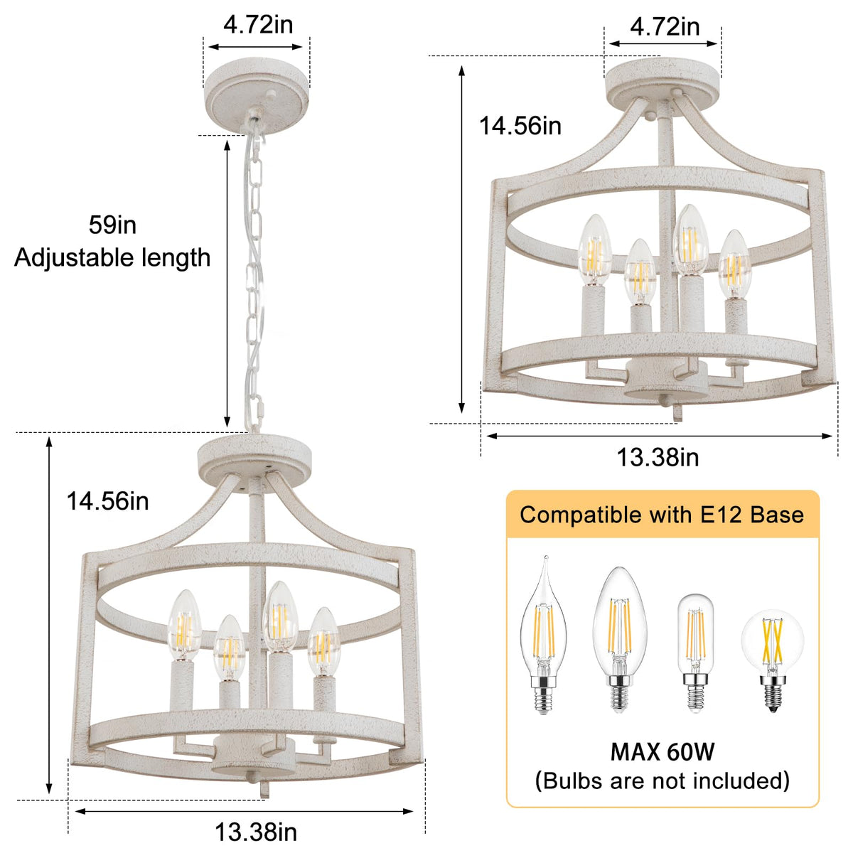 Kmaipem 2-In-1 Convertible Hanging & Semi-Flush Mount Light Fixture The Farmhouse Chandelier For Dining Room Is Crafted From Metal, Its Frame Strikes A Classic Retro Candle-Style, And It Is Equipped With A Removable Chain, Which Can Concert To Semi Flush Mount Light Fixture. Size Material: Metal Finished: Antique White Diameter Of The Chandelier: 13.4'' Diameter Of The Ceiling Base: 4.72'' Total Height: Can Be Adjusted From 15'' To 74''(59'' Adjustable Chain) Specifications Lights: 4 X E12 Bulbs(Bulbs Not Included) Voltage: 110V~220V Max Watts Per Bulb: 60 Watt Ul Listed: Wire And Light Socket Are Ul Listed Dimmable: Compatible With Dimmer Switch And Dimmable Bulbs. (Switch And Bulbs Are Not Include Detail: 2-In-1 Concertible Hanging & Semi-Flush Mount Retro Shape, Elegant Geometric Pattern All Ceiling Are Available 100% Handmade Distressed White Finish